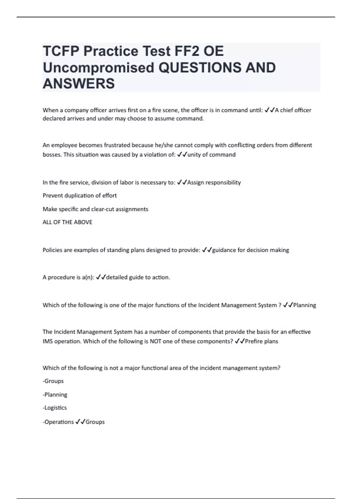 When a company officer arrives first on a fire scene, the officer is in command until: A chief officer declared arrives and under may choose to assume command. An employee becomes frustrated because he/she cannot comply with conflicting orders from different bosses. This situation was caused by a violation of: unity of command In the fire service, division of labor is necessary to: Assign responsibility Prevent duplication of effort Make specific and clear-cut assignments ALL OF THE ABOVE Policies are examples of standing plans designed to provide: guidance for decision making A procedure is a(n): detailed guide to action. Which of the following is one of the major functions of the Incident Management System ? Planning The Incident Management System has a number of components that provide the basis for an effective IMS operation. Which of the following is NOT one of these components? Prefire plans Which of the following is not a major functional area of the incident management system? -Groups -Planning -Logistics -Operations Groups