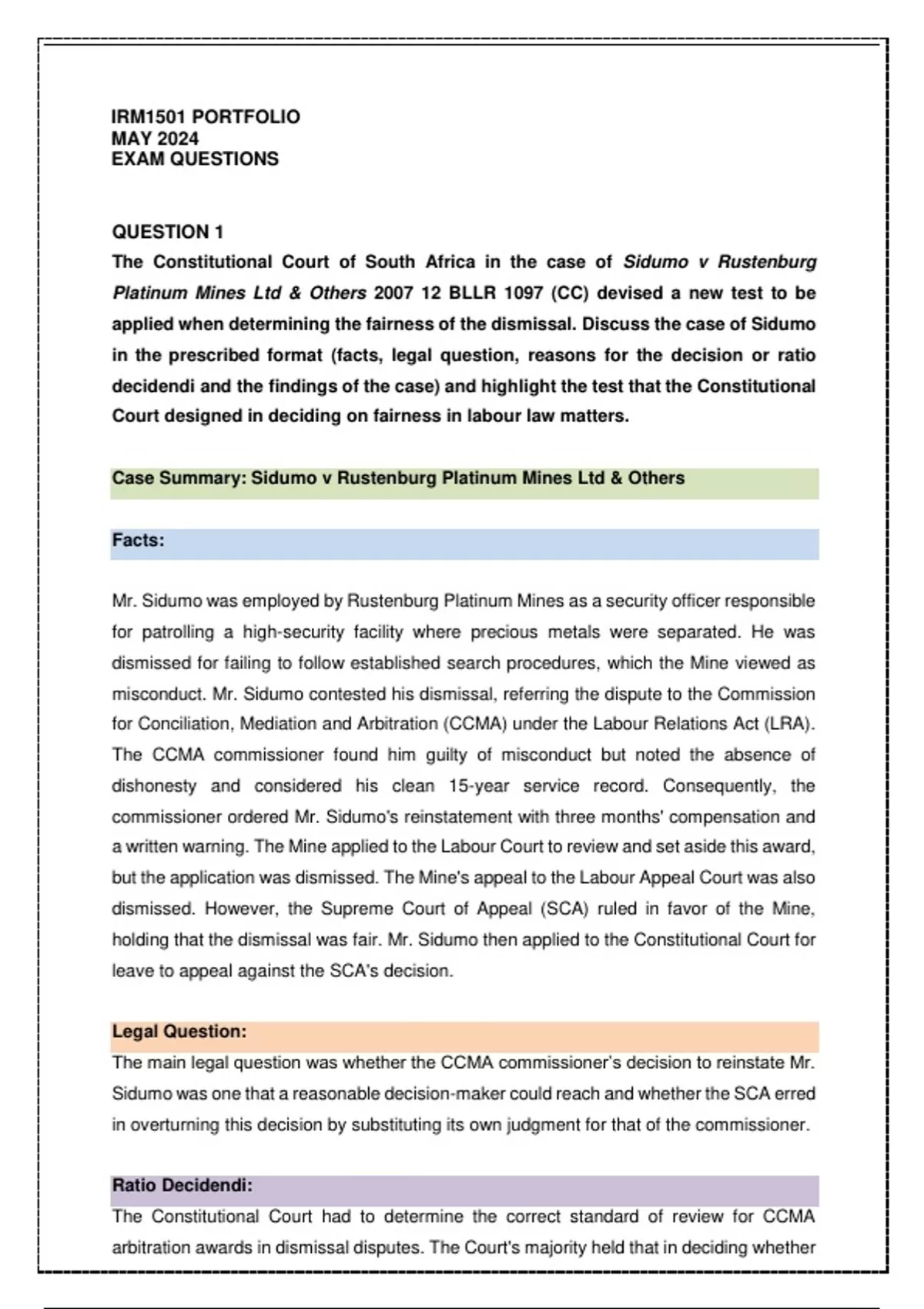 Case Summary: Sidumo v Rustenburg Platinum Mines Ltd & Others