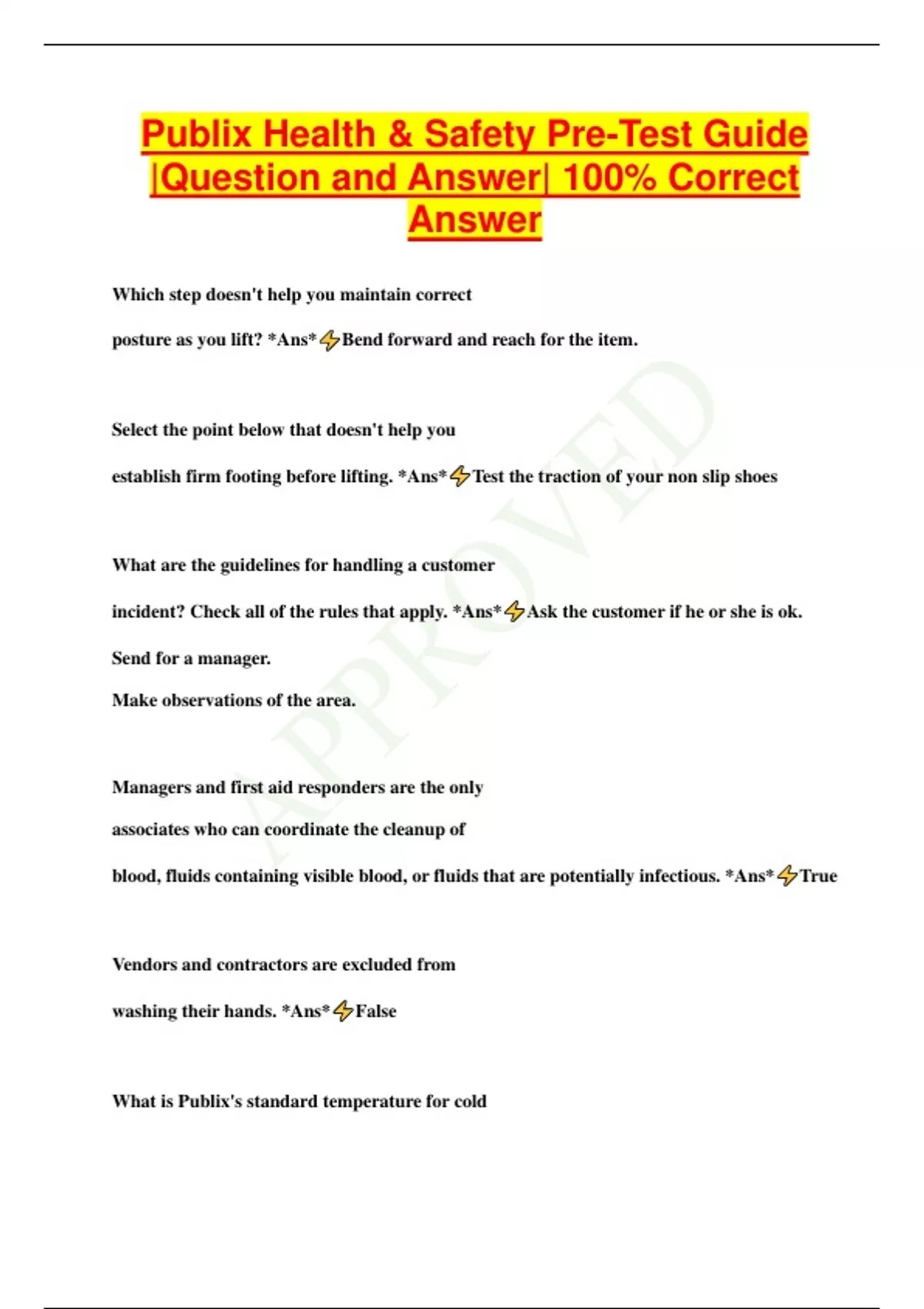 Publix Health & Safety Pre-Test Guide |Question and Answer| 100% Correct Answer Which step doesn't help you maintain correct posture as you lift? *Ans* Bend forward and reach for the item. Select the point below that doesn't help you establish firm footing before lifting. *Ans* Test the traction of your non slip shoes What are the guidelines for handling a customer incident? Check all of the rules that apply. *Ans* Ask the customer if he or she is ok. Send for a manager. Make observations of the area. Managers and first aid responders are the only associates who can coordinate the cleanup of blood, fluids containing visible blood, or fluids that are potentially infectious. *Ans* True Vendors and contractors are excluded from washing their hands. *Ans* False What is Publix's standard temperature for cold foods? *Ans* At or below 40 degrees Fahrenheit. What is Publix's standard temperature for hot foods? *Ans* At or above 140 degrees Fahrenheit. What do you do if you find a hot or cold item on a dry grocery shelf? *Ans* Find a manager and give them the item to decide if it's okay to re-shelve. Which of the following listed below do you not have to report to your manager? *Ans* Headache Which of the following isn't a food safety hazard? *Ans* Genetic How often should you wash your hands? *Ans* Frequently To identify a handwashing sink, y