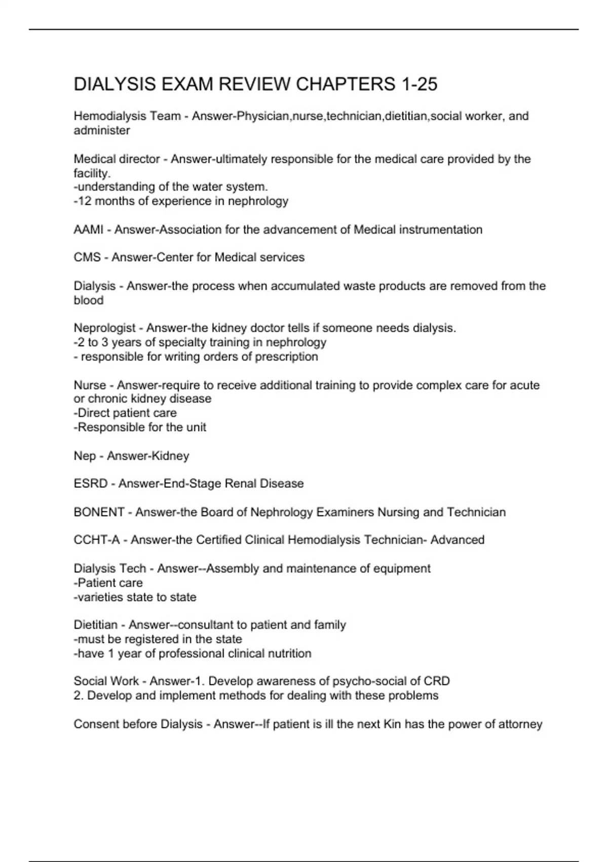 DIALYSIS EXAM REVIEW CHAPTERS 1-25