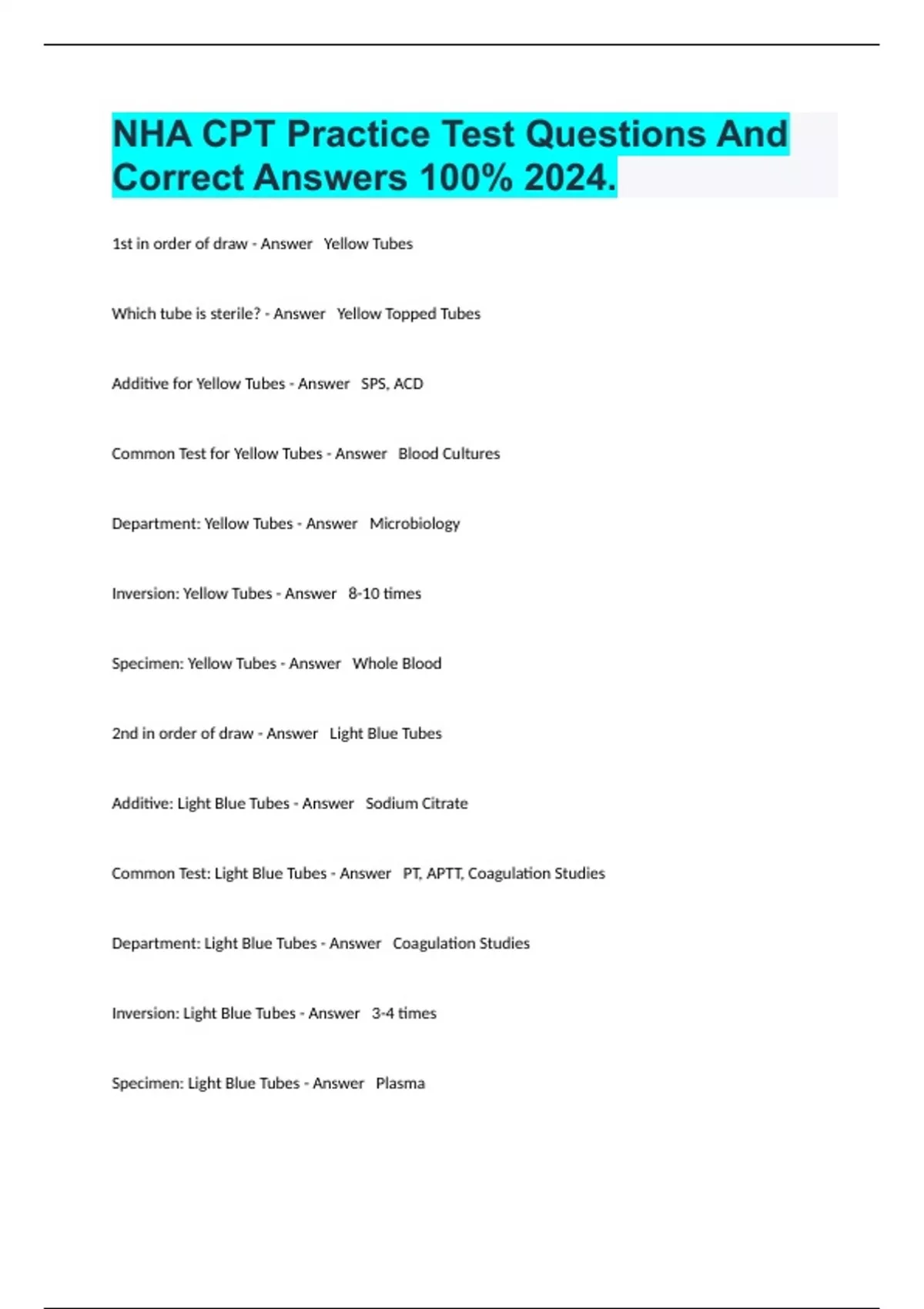 1st in order of draw - Answer Yellow Tubes Which tube is sterile? - Answer Yellow Topped Tubes Additive for Yellow Tubes - Answer SPS, ACD Common Test for Yellow Tubes - Answer Blood Cultures Department: Yellow Tubes - Answer Microbiology Inversion: Yellow Tubes - Answer 8-10 times Specimen: Yellow Tubes - Answer Whole Blood 2nd in order of draw - Answer Light Blue Tubes Additive: Light Blue Tubes - Answer Sodium Citrate Common Test: Light Blue Tubes - Answer PT, APTT, Coagulation Studies Department: Light Blue Tubes - Answer Coagulation Studies Inversion: Light Blue Tubes - Answer 3-4 times Specimen: Light Blue Tubes - Answer Plasma