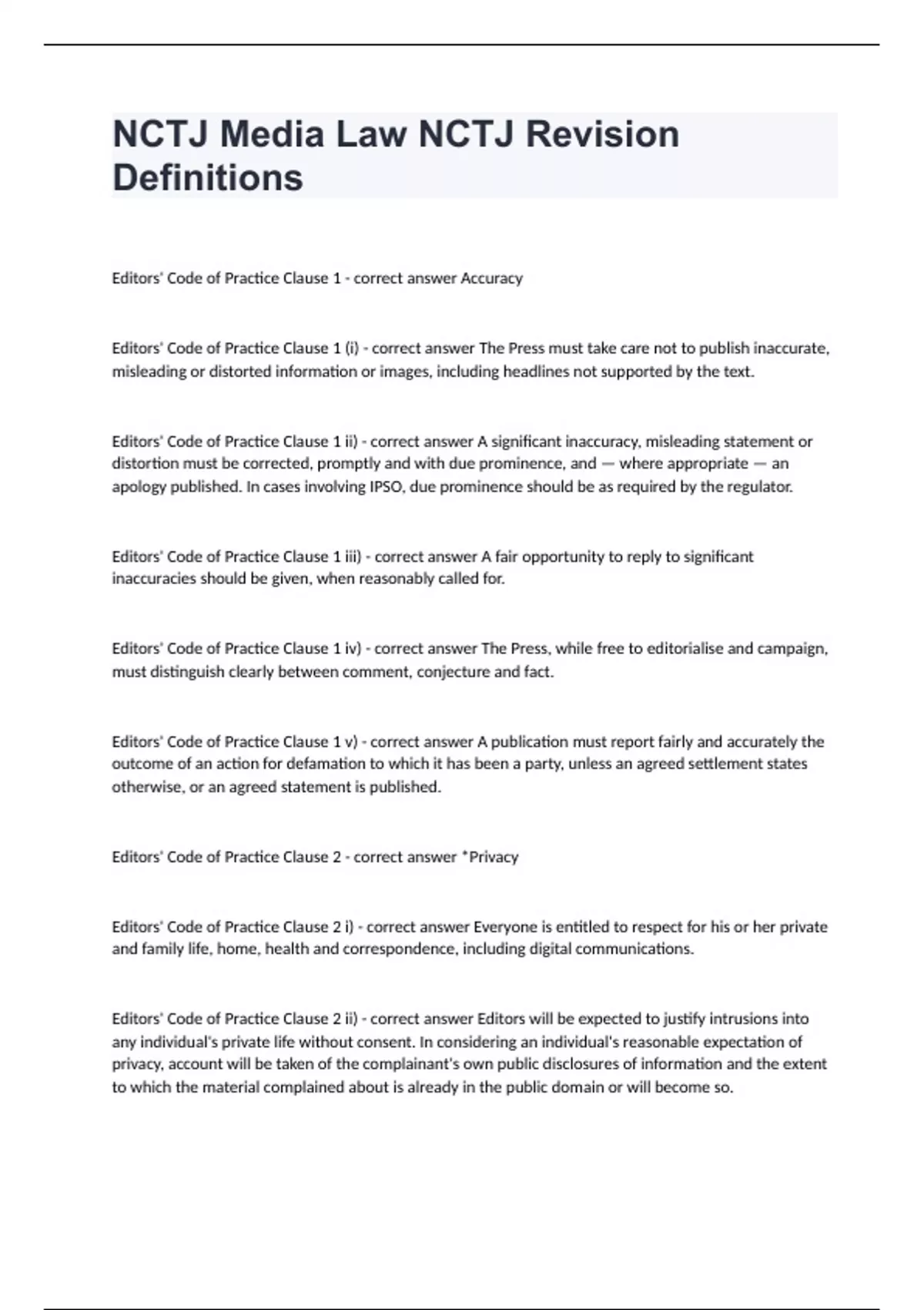NCTJ Media Law NCTJ Revision Definitions Question and answers 100% correct NCTJ Media Law NCTJ Revision Definitions Editors' Code of Practice Clause 1 - correct answer Accuracy Editors' Code of Practice Clause 1 (i) - correct answer The Press must take care not to publish inaccurate, misleading or distorted information or images, including headlines not supported by the text. Editors' Code of Practice Clause 1 ii) - correct answer A significant inaccuracy, misleading statement or distortion must be corrected, promptly and with due prominence, and — where appropriate — an apology published. In cases involving IPSO, due prominence should be as required by the regulator. Editors' Code of Practice Clause 1 iii) - correct answer A fair opportunity to reply to significant inaccuracies should be given, when reasonably called for. Editors' Code of Practice Clause 1 iv) - correct answer The Press, while free to editorialise and campaign, must distinguish clearly between comment, conjecture and fact. Editors' Code of Practice Clause 1 v) - correct answer A publication must report fairly and accurately the outcome of an action for defamation to which it has been a party, unless an agreed settlement states otherwise, or an agreed statement is published. Editors' Code of Practice Clause 2 - correct answer *Privacy Editors' Code of Practice Clause 2 i) - correct answer Everyone is entitled to respect for his or her private and family life, home, health and correspondence, including digital communications. Editors' Code of Practice Clause 2 ii) - correct answer Editors will be expected to justify intrusions into any individual's private life without consent. In considering an individual's reasonable expectation of privacy, account will be taken of the complainant's own public disclosures of information and the extent to which the material complained about is a