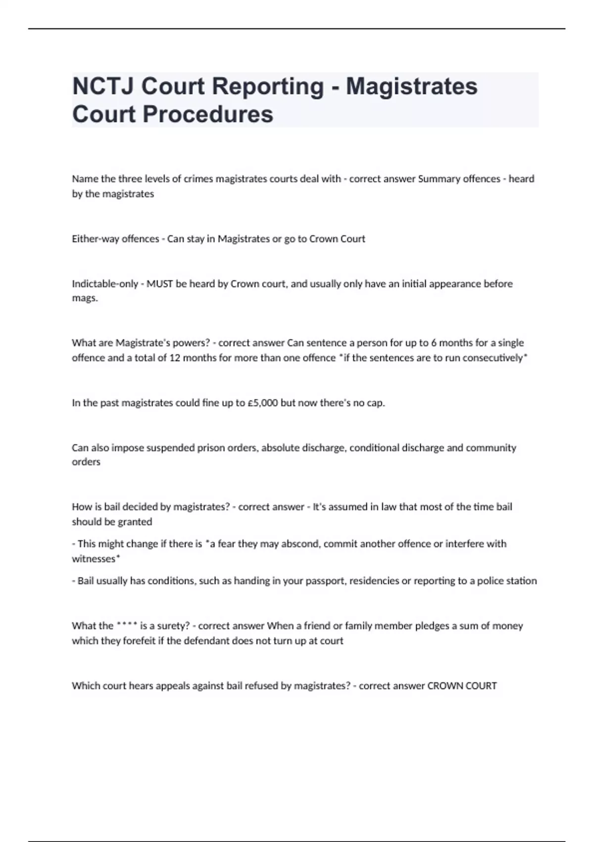 NCTJ Court Reporting - Magistrates Court Procedures Questions and answers rated A+ NCTJ Court Reporting - Magistrates Court Procedures Name the three levels of crimes magistrates courts deal with - correct answer Summary offences - heard by the magistrates Either-way offences - Can stay in Magistrates or go to Crown Court Indictable-only - MUST be heard by Crown court, and usually only have an initial appearance before mags. What are Magistrate's powers? - correct answer Can sentence a person for up to 6 months for a single offence and a total of 12 months for more than one offence *if the sentences are to run consecutively* In the past magistrates could fine up to £5,000 but now there's no cap. Can also impose suspended prison orders, absolute discharge, conditional discharge and community orders How is bail decided by magistrates? - correct answer - It's assumed in law that most of the time bail should be granted - This might change if there is *a fear they may abscond, commit another offence or interfere with witnesses* - Bail usually has conditions, such as handing in your passport, residencies or reporting to a police station What the **** is a surety? - correct answe
