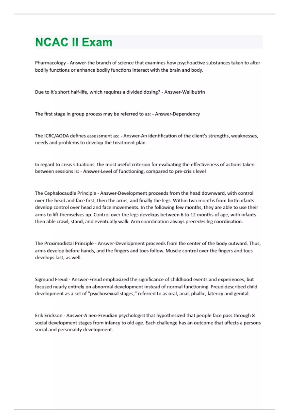 Pharmacology - Answer-the branch of science that examines how psychoactive substances taken to alter bodily functions or enhance bodily functions interact with the brain and body. Due to it's short half-life, which requires a divided dosing? - Answer-Wellbutrin The first stage in group process may be referred to as: - Answer-Dependency The ICRC/AODA defines assessment as: - Answer-An identification of the client's strengths, weaknesses, needs and problems to develop the treatment plan. In regard to crisis situations, the most useful criterion for evaluating the effectiveness of actions taken between sessions is: - Answer-Level of functioning, compared to pre-crisis level The Cephalocaudle Principle - Answer-Development proceeds from the head downward, with control over the head and face first, then the arms, and finally the legs. Within two months from birth infants develop control over head and face movements. In the following few months, they are able to use their arms to lift themselves up. Control over the legs develops between 6 to 12 months of age, with infants then able crawl, stand, and eventually walk. Arm coordination always precedes leg coordination. The Proximodistal Principle - Answer-Development proceeds from the center of the body outward. Thus, arms develop before hands, and the fingers and toes follow. Muscle control over the fingers and toes develops last, as well. Sigmund Freud - Answer-Freud emphasized the significance of childhood events and experiences, but focused nearly entirely on abnormal development instead of normal functioning. Freud described child development as a set of "psychosexual stages," referred to as oral, anal, phallic, latency and genital. Erik Erickson - Answer-A neo-Freudian psychologist that hypothesized that people face pass through 8 social development stages from infancy to old age. Each challenge has an outcome that affects a persons social and personality development.Jean Piaget - Answer-Theorist Jean Piaget focused primarily on the mental aspects of childhood, and proposed a four-stage theory of cognitive development. He pioneered the idea that children's knowledge of the world is gained by active interaction, describing them as "little scientists" in this endeavor. Rational Emotive Psychotherapy - Answer-The earliest form of a cognitive-behaviour approach to social work practice, in which personal problems are understood to be the result of irrational patterns of thinking and the dysfunctional behaviours that happen as a result. The goal of the therapist is to help a client to see that the negative emotions experienced are due to a flawed perception of reality. Motivational Enhancement Therapy - Answer-a brief, nonconfrontational, client-centered therapy designed to change specific problematic behaviors such as alcohol or drug use Freudian Psychoanalytic Theory - Answer-based on the idea that people are influenced considerably by their unconscious, inner drives. Cognitive Behavioral Therapy - Answer-a popular integrative therapy that combines cognitive therapy (changing self-defeating thinking) with behavior therapy (changing behavior) Socratic Dialogue - Answer-A process that cognitive therapists use in helping clients empirically test their core beliefs. Clients form hypotheses about their behavior through observation and monitoring. Gestalt therapy - Answer-therapy that aims to integrate different and sometimes opposing aspects of personality into a unified sense of self Person Centered Therapy - Answer-a nondirective insight therapy based on the work of Carl Rogers in which the client does all the talking and the therapist listens Priviledge - Answer-refers to the right of an individual not to have confidential information disclosed in legal proceedings. Transactional Analysis - Answer-treatment that focuses on patterns of interaction with others, especially patterns that indicate personal problemsWhen is privilege waived? - Answer-Privilege is waived in the following ways: 1) when the client has agreed that the counselor may reveal confidential information, 2) when a third person has been made privy to the information, and 3) under certain legal conditions. The therapist cannot claim privilege once the client has agreed to waive privilege