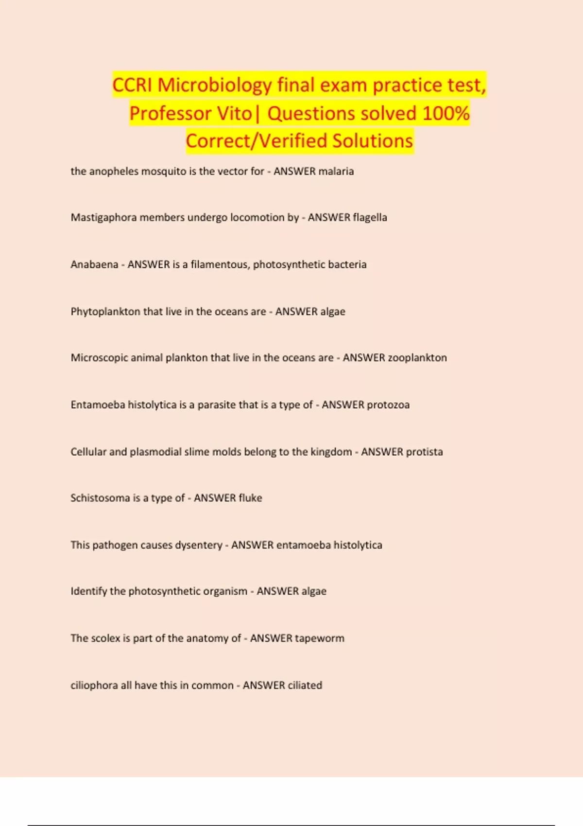 CCRI Microbiology final exam practice test, Professor Vito| Questions solved 100% Correct/Verified Solutions