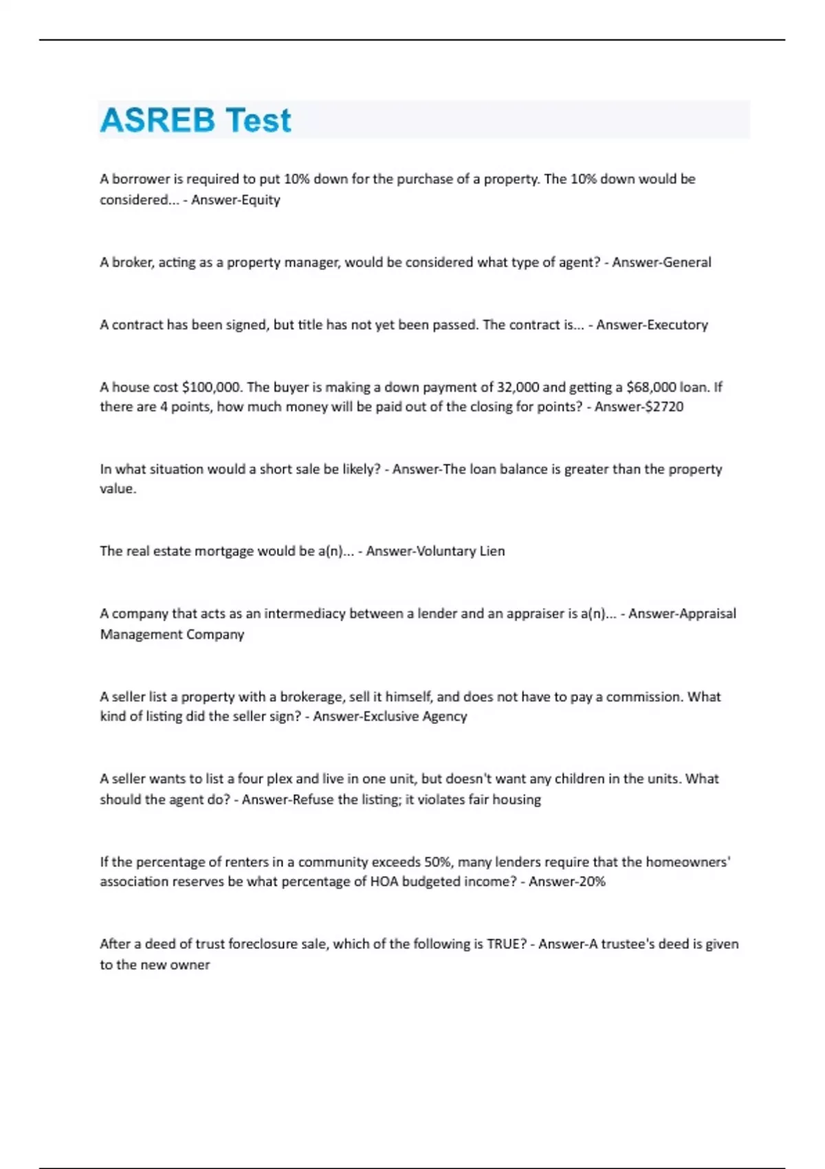 A borrower is required to put 10% down for the purchase of a property. The 10% down would be considered... - Answer-Equity A broker, acting as a property manager, would be considered what type of agent? - Answer-General A contract has been signed, but title has not yet been passed. The contract is... - Answer-Executory A house cost $100,000. The buyer is making a down payment of 32,000 and getting a $68,000 loan. If there are 4 points, how much money will be paid out of the closing for points? - Answer-$2720 In what situation would a short sale be likely? - Answer-The loan balance is greater than the property value. The real estate mortgage would be a(n)... - Answer-Voluntary Lien A company that acts as an intermediacy between a lender and an appraiser is a(n)... - Answer-Appraisal Management Company A seller list a property with a brokerage, sell it himself, and does not have to pay a commission. What kind of listing did the seller sign? - Answer-Exclusive Agency A seller wants to list a four plex and live in one unit, but doesn't want any children in the units. What should the agent do? - Answer-Refuse the listing; it violates fair housing If the percentage of renters in a community exceeds 50%, many lenders require that the homeowners' association reserves be what percentage of HOA budgeted income? - Answer-20% After a deed of trust foreclosure sale, which of the following is TRUE? - Answer-A trustee's deed is given to the new ownerAfter a mortgage foreclosure, if the sale amount was insufficient to cover the debt, the lender may ask for a(n)... - Answer-deficiency judgment An option once exercised is considered... - Answer-Unilateral executed At what point does recordation take place? - Answer-When a docket and page number are assigned What is required at the time an Affidavit of Affixture is recorded? - Answer-The titles to the mobile home must be surrendered A broker has what duty to a third party? - Answer-full disclosure of all material facts How can a buyer be assured of getting his earnest money back if his loan is not approved? - AnswerPlace a contingency clause in the contract A legal description reads as follows: "The NW 1/4 of Section 2 and the W 1/2 of the SW 1/4 of section 35." How man acres is this? - Answer-240 acres If a tenant abandons a residential apartment, the landlord must do all of the following EXCEPT... - Answer-Sell the tenant's personal property after holding it for 10 days How many townships are in a 24-mile square? - Answer-16 If there are material changes from an original Public Report, the Commissioner may required the subdivider to create a(n)... - Answer-amended Public Report If cap rates in an area are going up, how does this influence value? - Answer-Value goes down In Arizona, property owned before marriage is sole and separate. Property acquired after marriage would be considered... - Answer-Community Property