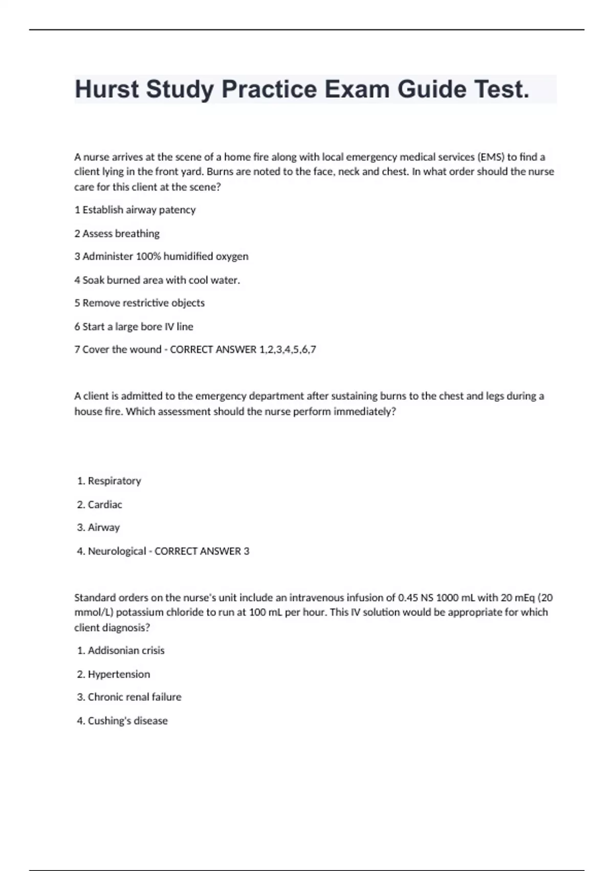 Hurst Written Exam Questions & Answers. A nurse arrives at the scene of a home fire along with local emergency medical services (EMS) to find a client lying in the front yard. Burns are noted to the face, neck and chest. In what order should the nurse care for this client at the scene? 1 Establish airway patency 2 Assess breathing 3 Administer 100% humidified oxygen 4 Soak burned area with cool water. 5 Remove restrictive objects 6 Start a large bore IV line 7 Cover the wound - CORRECT ANSWER 1,2,3,4,5,6,7 A client is admitted to the emergency department after sustaining burns to the chest and legs during a house fire. Which assessment should the nurse perform immediately? 1. Respiratory 2. Cardiac 3. Airway 4. Neurological - CORRECT ANSWER 3 Standard orders on the nurse's unit include an intravenous infusion of 0.45 NS 1000 mL with 20 mEq (20 mmol/L) potassium chloride to run at 100 mL per hour. This IV solution would be appropriate for which client diagnosis? 1. Addisonian crisis 2. Hypertension 3. Chronic renal failure 4. Cushing's disease 5. Hypokalemia - CORRECT ANSWER 4, 5 A nurse educator has completed an educational program on interpreting arterial blood gases (ABGs). The educator recognizes that education has been successful when a nurse selects which set of ABGs as metabolic acidosis? 1. pH - 7.32, PaCO2 - 48, HCO3 - 23 2. pH - 7.29, PaCO2 - 42, HCO3 - 19 3. pH - 7.5, PaCO2 - 30, HCO3 - 22 4. pH - 7.35, PaCO2 - 35, HCO3 - 26 - CORRECT ANSWER 2 The client has pustules on the arm from intravenous drug abuse. The microbiology laboratory informs the nurse that the client's cultures are growing methicillin-resistant Staphylococcus aureus (MRSA). Which action would the nurse take? 1. Implement droplet precautions immediately. 2. Inform the client to wear a mask when ambulating in the hall. 3. Instruct the client on the importance of hand hygiene. 4. Cover the pustules to prevent drainage. 5. Allow pustules to drain freely. - CORRECT ANSWER 3,4