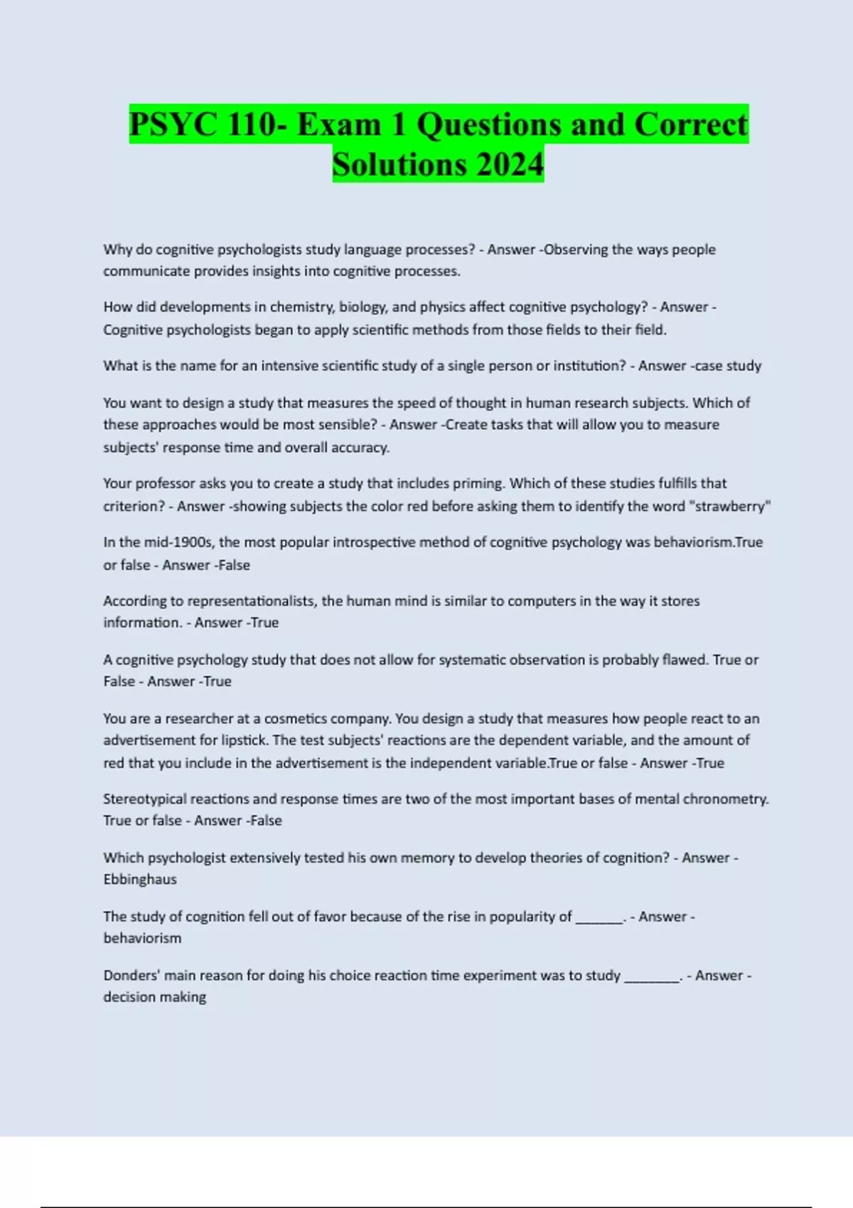 PSYC 110- Exam 1 Questions and Correct Solutions 2024 Why do cognitive psychologists study language processes? - Answer -Observing the ways people communicate provides insights into cognitive processes. How did developments in chemistry, biology, and physics affect cognitive psychology? - Answer - Cognitive psychologists began to apply scientific methods from those fields to their field. What is the name for an intensive scientific study of a single person or institution? - Answer -case study You want to design a study that measures the speed of thought in human research subjects. Which of these approaches would be most sensible? - Answer -Create tasks that will allow you to measure subjects' response time and overall accuracy. Your professor asks you to create a study that includes priming. Which of these studies fulfills that criterion? - Answer -showing subjects the color red before asking them to identify the word "strawberry" In the mid-1900s, the most popular introspective method of cognitive psychology was behaviorism.True or false - Answer -False According to representationalists, the human mind is similar to computers in the way it stores information. - Answer -True A cognitive psychology study that does not allow for systematic observation is probably flawed. True or False - Answer -True You are a researcher at a cosmetics company. You design a study that measures how people react to an advertisement for lipstick. The test subjects' reactions are the dependent variable, and the amount of red that you include in the advertisement is the independent variable.True or false - Answer -True Stereotypical reactions and response times are two of the most important bases of mental chronometry. True or false - Answer -False Which psychologist extensively tested his own memory to develop theories of cognition? - Answer - Ebbinghaus The study of cognition fell out of favor because of the rise in popularity of ______. - Answer - behaviorism Donders' main reason for doing his choice reaction time experiment was to study _______. - Answer - decision makingThe first experiments in cognitive psychology were based on the idea that mental responses can be _______. - Answer -inferred from the participant's behavior. According to Ebbinghaus' forgetting curve, forgetting is a function of ______. - Answer -Elapsed time Which of the following methods was used in the psychology laboratory established by Wilhelm Wundt? - Answer -analytic introspection John Watson believed that psychology should focus on the study of ___