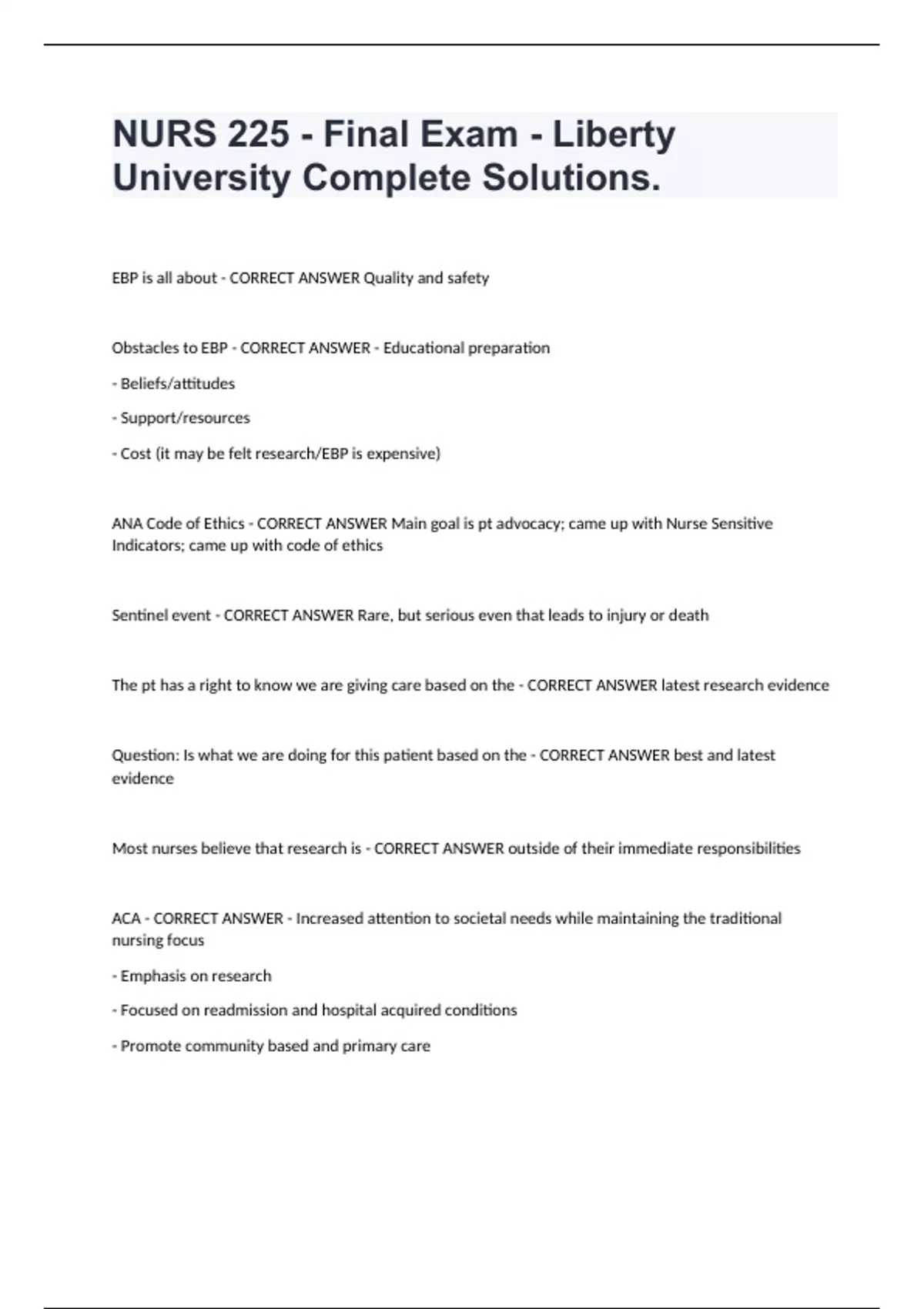 NURS 225 - Final Exam - Liberty University Complete Solutions. EBP is all about - CORRECT ANSWER Quality and safety Obstacles to EBP - CORRECT ANSWER - Educational preparation - Beliefs/attitudes - Support/resources - Cost (it may be felt research/EBP is expensive) ANA Code of Ethics - CORRECT ANSWER Main goal is pt advocacy; came up with Nurse Sensitive Indicators; came up with code of ethics Sentinel event - CORRECT ANSWER Rare, but serious even that leads to injury or death The pt has a right to know we are giving care based on the - CORRECT ANSWER latest research evidence Question: Is what we are doing for this patient based on the - CORRECT ANSWER best and latest evidence