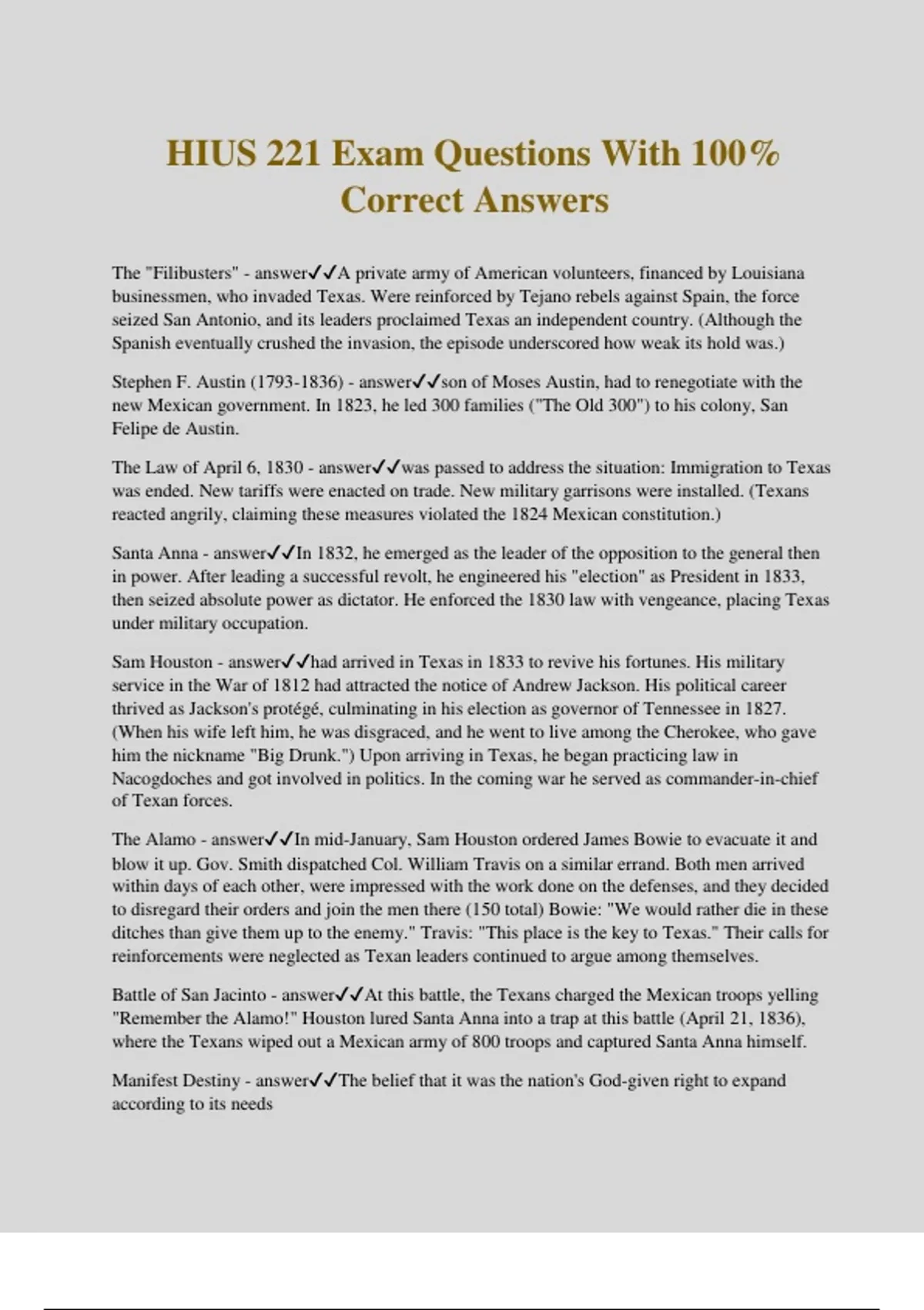 HIUS 221 Exam Questions With 100% Correct Answers The "Filibusters" - answerA private army of American volunteers, financed by Louisiana businessmen, who invaded Texas. Were reinforced by Tejano rebels against Spain, the force seized San Antonio, and its leaders proclaimed Texas an independent country. (Although the Spanish eventually crushed the invasion, the episode underscored how weak its hold was.) Stephen F. Austin () - answerson of Moses Austin, had to renegotiate with the new Mexican government. In 1823, he led 300 families ("The Old 300") to his colony, San Felipe de Austin. The Law of April 6, 1830 - answerwas passed to address the situation: Immigration to Texas was ended. New tariffs were enacted on trade. New military garrisons were installed. (Texans reacted angrily, claiming these measures violated the 1824 Mexican constitution.) Santa Anna - answerIn 1832, he emerged as the leader of the opposition to the general then in power. After leading a successful revolt, he engineered his "election" as President in 1833, then seized absolute power as dictator. He enforced the 1830 law with vengeance, placing Texas under military occupation. Sam Houston - answerhad arrived in Texas in 1833 to revive his fortunes. His military service in the War of 1812 had attracted the notice of Andrew Jackson. His political career thrived as Jackson's protégé, culminating in his election as governor of Tennessee in 1827. (When his wife left him, he was disgraced, and he went to live among the Cherokee, who gave him the nickname "Big Drunk.") Upon arriving in Texas, he began practicing law in Nacogdoches and got involved in politics. In the coming war he served as commander-in-chief of Texan forces. The Alamo - answerIn mid-January, Sam Houston ordered James Bowie to evacuate it and blow it up. Gov. Smith dispatched Col. William Travis on a similar errand. Both men arrived within days of each other, were impressed with the work done on the defenses, and they decided to disregard their orders and join the men there (150 total) Bowie: "We would rather die in these ditches than give them up to the enemy." Travis: "This place is the key to Texas." Their calls for reinforcements were neglected as Texan leaders continued to argue among themselves. Battle of San Jacinto - answerAt this battle, the Texans charged the Mexican troops yelling "Remember the Alamo!" Houston lured Santa Anna into a trap at this battle (April 21, 1836), where the Texans wiped out a Mexican army of 800 troops and captured Santa Anna himself. Manifest Destiny - answerThe belief that it was the nation's God-given right to expand according to its needs James K. Polk - answerDuring the presidential campaign of 1844, this Democratic nominee called for American expansion westward. He interpreted his election, though he only won by a narrow margin, as an endorsement of his expansionist position. In his inaugural address (1845), he spent considerable time defending American expansion as a means of creating and preserving a more powerful Union. The Oregon Country - answerBeginning in 1818, Britain and the US jointly occupied this country. Its population of British, French, Native American, and Hawaiian trappers and entrepreneurs frequently formed mixed-race families until the 1840's. When "(blank) fever" swept thousands of white Americans into the Willamette Valley, the new settlers adopted polices that excluded non-white emigrants. The (blank) Treaty of 1846 established the border between Canada and the U.S. at the forty-ninth parallel, despite President Polk's 1844 campaign slogan, "Fifty-four Forty, or Fight!" It became a state in 1859 The "Nueces Strip" - answerMexican officials cut diplomatic relations with the US and declared the Mexico-Texas border to be the (blank) River. (This was in defiance of the Texan- American claim that the Rio Grande marked the southern border of Texas.) The Mexican-American War - answerMexico started the war, Southerners supported the war, Northerners opposed the war, and Mexicans wanted the war just as much as Americans did. The war consisted of three campaigns by American forces: (1) Taylor's army invaded northern Mexico, took Monterey, and defeated Santa Anna's army at the battle of Buena Vista (2/23/1847), despite being outnumbered three-to-one. (2) Another small American force marched along the Santa Fe Trail from Missouri, eventually making its way to California, where it aided Hispanic and American rebels who had thrown off Mexican authority. (3) When Mexico refused to negotiate, another American army under General Winfield Scott landed on the Mexican coast at Veracruz. (This is a gimme) Zachary Taylor - answerIn July 1845, Polk dispatched this general to Corpus Christi, north of the disputed area, to establish a military presence with an army of 3,500 troops. After the rejection of Sildell's offer, in March 1846, Polk ordered him to cross the Nueces and establish a base on the Rio Grande across from Matamoros. Winfield Scott - answerWhen Mexico refused to negotiate, another American army under this general landed on the Mexican coast at Veracruz. After bombarding Veracruz into surrender, his army drove inland toward Mexico City. After routing Santa Anna in two more battles, he seized Mexico City on September 14, 1847. Treaty of Guadalupe Hidalgo - answerOn February 2, 1848, this Treaty was signed. The southern boundary of Texas was set at the Rio Grande. The US gained: Present-day states of California, Nevada, and Utah. Most of Arizona and New Mexico. And parts of Colorado and Wyoming. The US also agreed to pay $15 million to Mexico and pay debts of Mexico to U.S. citizens. American troops left Mexico in June.