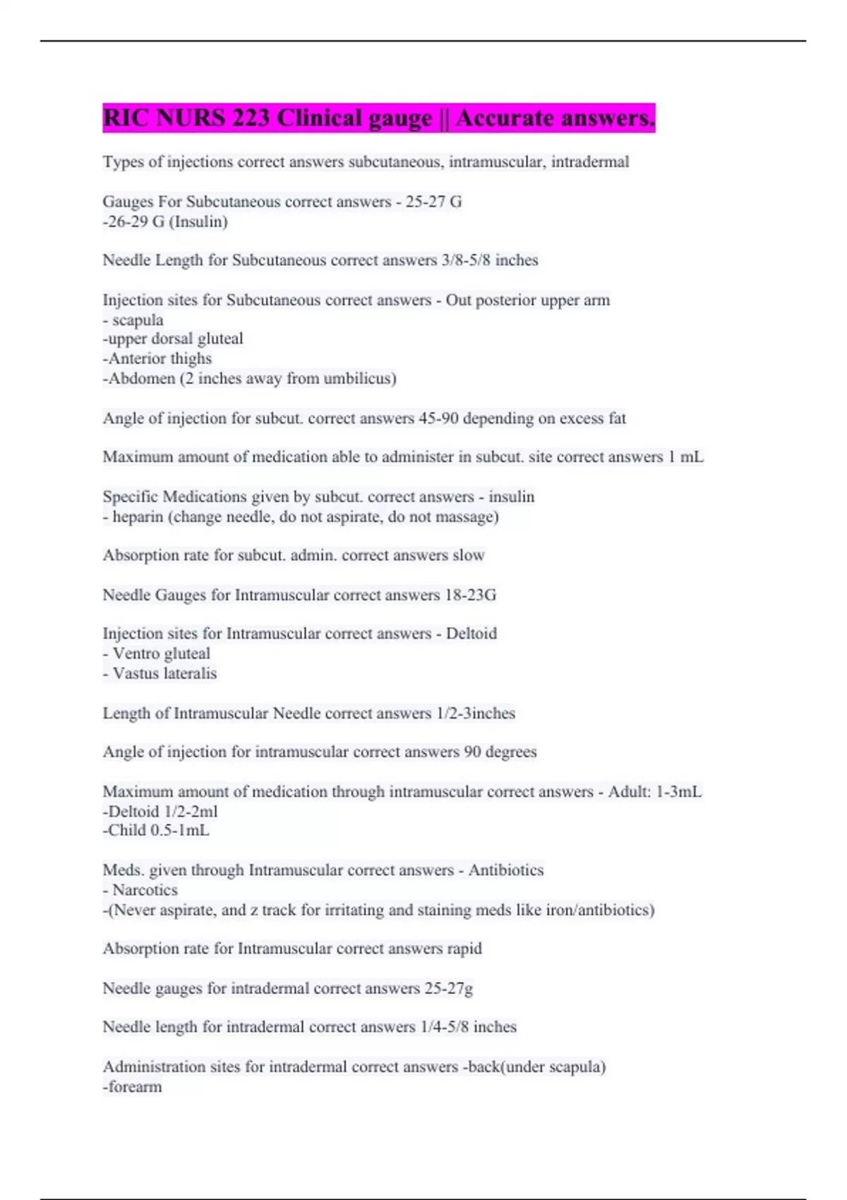 Types of injections correct answers subcutaneous, intramuscular, intradermal Gauges For Subcutaneous correct answers - 25-27 G -26-29 G (Insulin) Needle Length for Subcutaneous correct answers 3/8-5/8 inches Injection sites for Subcutaneous correct answers - Out posterior upper arm - scapula -upper dorsal gluteal -Anterior thighs -Abdomen (2 inches away from umbilicus) Angle of injection for subcut. correct answers 45-90 depending on excess fat Maximum amount of medication able to administer in subcut. site correct answers 1 mL Specific Medications given by subcut. correct answers - insulin - heparin (change needle, do not aspirate, do not massage) Absorption rate for subcut. admin. correct answers slow Needle Gauges for Intramuscular correct answers 18-23G Injection sites for Intramuscular correct answers - Deltoid - Ventro gluteal - Vastus lateralis Length of Intramuscular Needle correct answers 1/2-3inches Angle of injection for intramuscular correct answers 90 degrees Maximum amount of medication through intramuscular correct answers - Adult: 1-3mL -Deltoid 1/2-2ml -Child 0.5-1mL Meds. given through Intramuscular correct answers - Antibiotics - Narcotics -(Never aspirate, and z track for irritating and staining meds like iron/antibiotics) Absorption rate for Intramuscular correct answers rapid Needle gauges for intradermal correct answers 25-27g Needle length for intradermal correct answers 1/4-5/8 inches Administration sites for intradermal correct answers -back(under scapula) -forearm