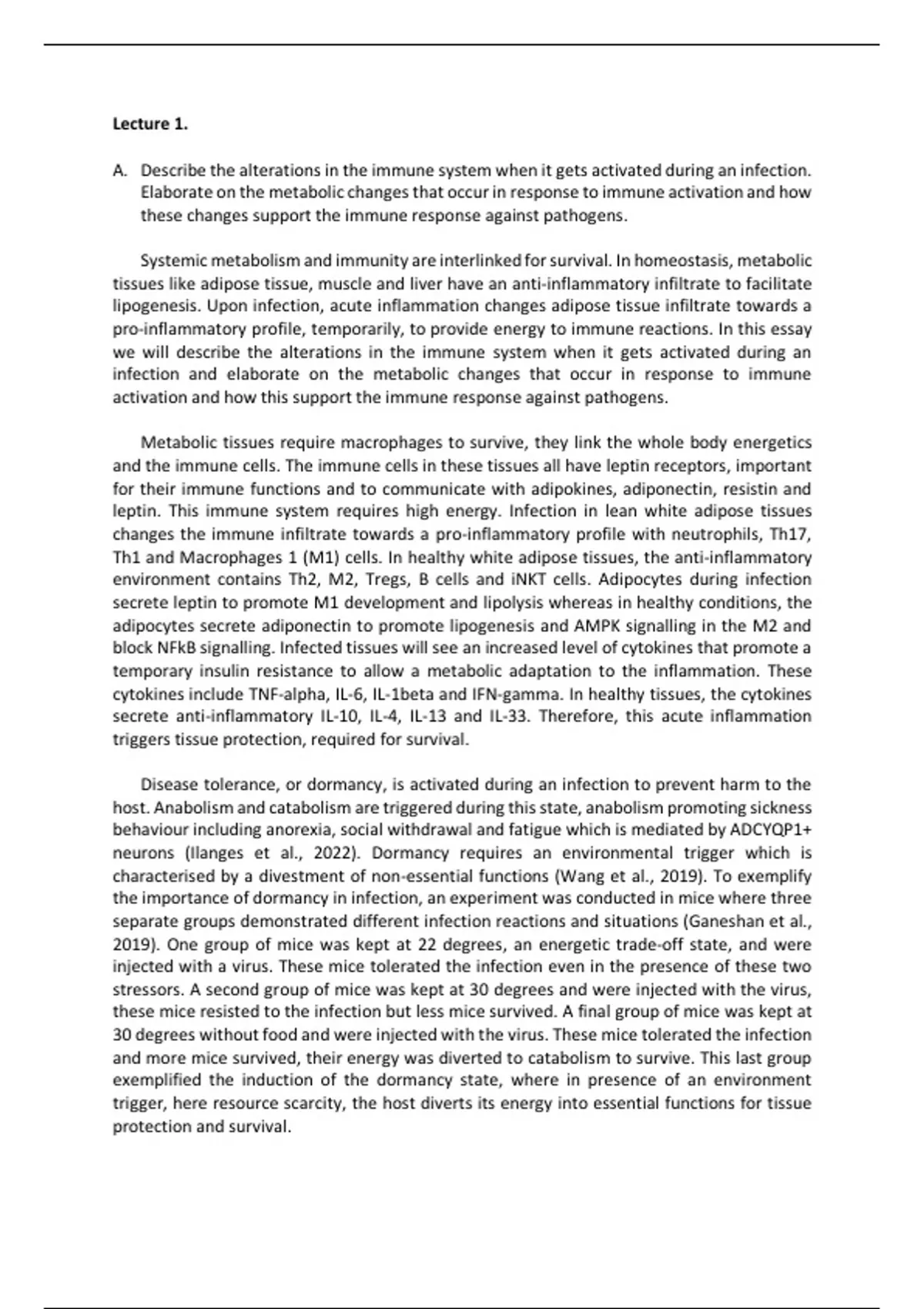 This essay covers all the lecture content of lecture 1 in Immunology of Human Disease. It explores Systemic immunometabolism, in health, disease and obesity. It includes additional reading on the subject. The first question is: Describe the alterations in the immune system when it gets activated during an infection. Elaborate on the metabolic changes that occur in response to immune activation and how these changes support the immune response against pathogens.