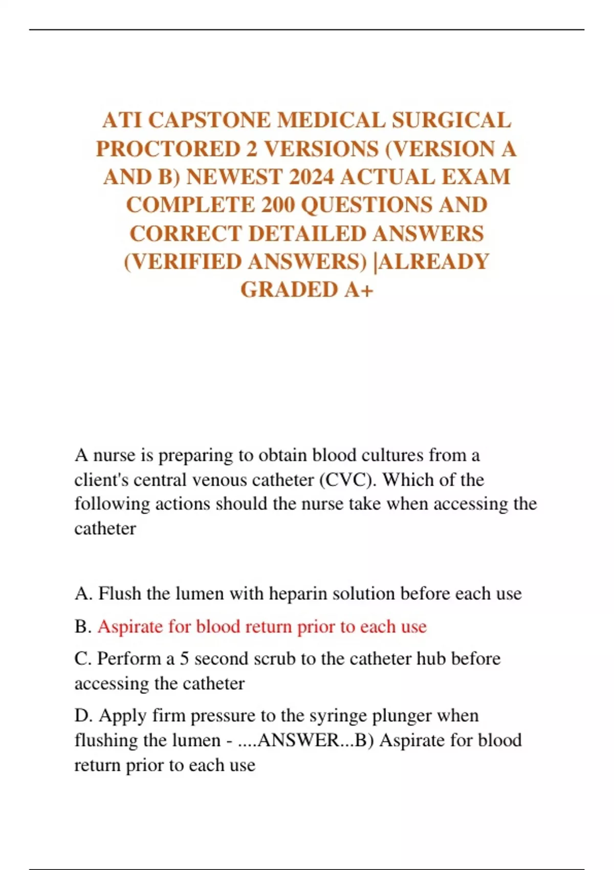 ATI CAPSTONE MEDICAL SURGICAL PROCTORED 2 VERSIONS (VERSION A AND B) NEWEST 2024 ACTUAL EXAM COMPLETE 200 QUESTIONS AND CORRECT DETAILED ANSWERS (VERIFIED ANSWERS) |ALREADY GRADED A+