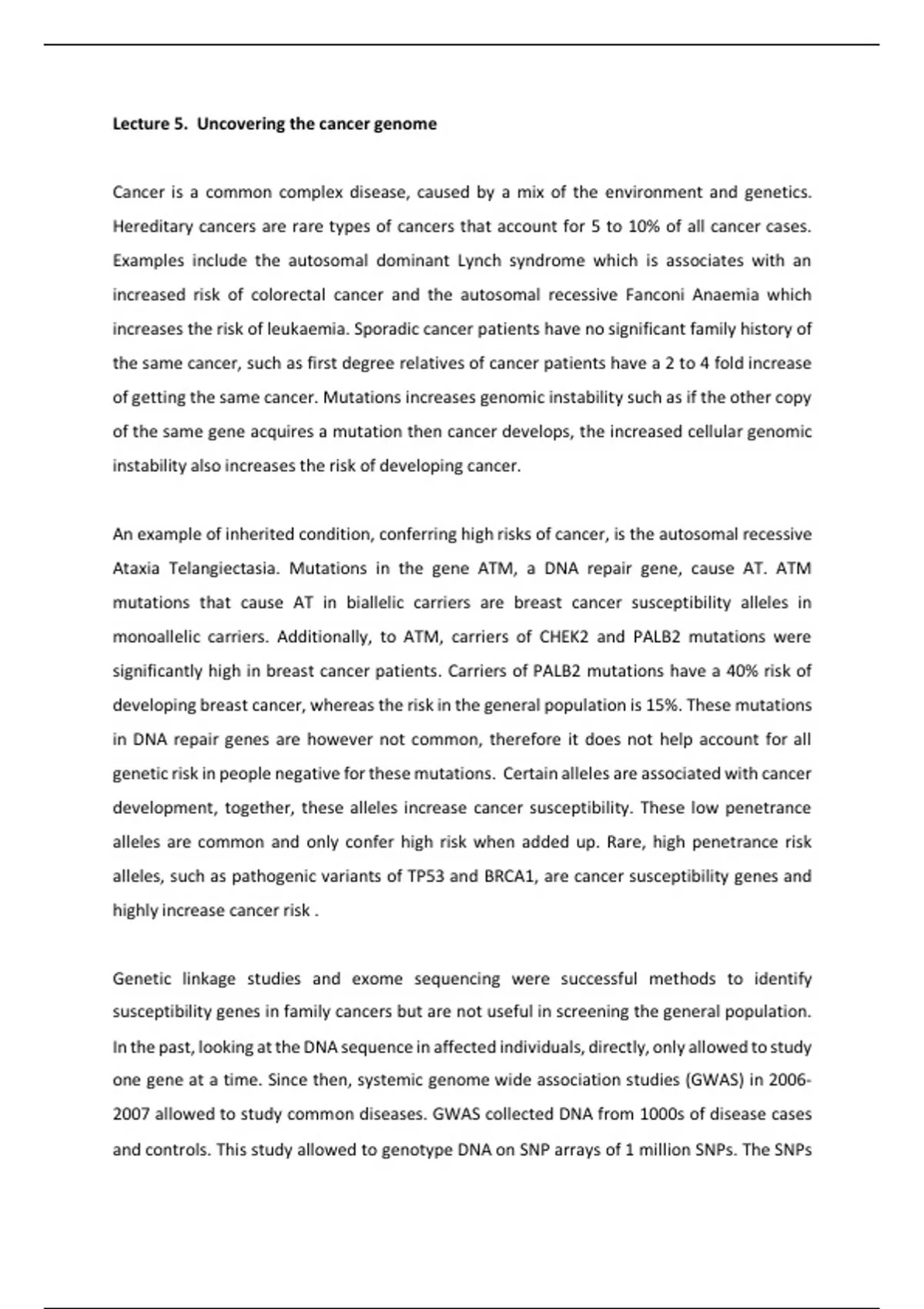 This essay focuses on the contents of Uncovering the cancer genome. There may also be some additional readings. Cancer is a common complex disease, caused by a mix of the environment and genetics. Hereditary cancers are rare types of cancers that account for 5 to 10% of all cancer cases. Examples include the autosomal dominant Lynch syndrome which is associates with an increased risk of colorectal cancer and the autosomal recessive Fanconi Anaemia which increases the risk of leukaemia. Sporadic cancer patients have no significant family history of the same cancer. Mutations increases genomic instability.