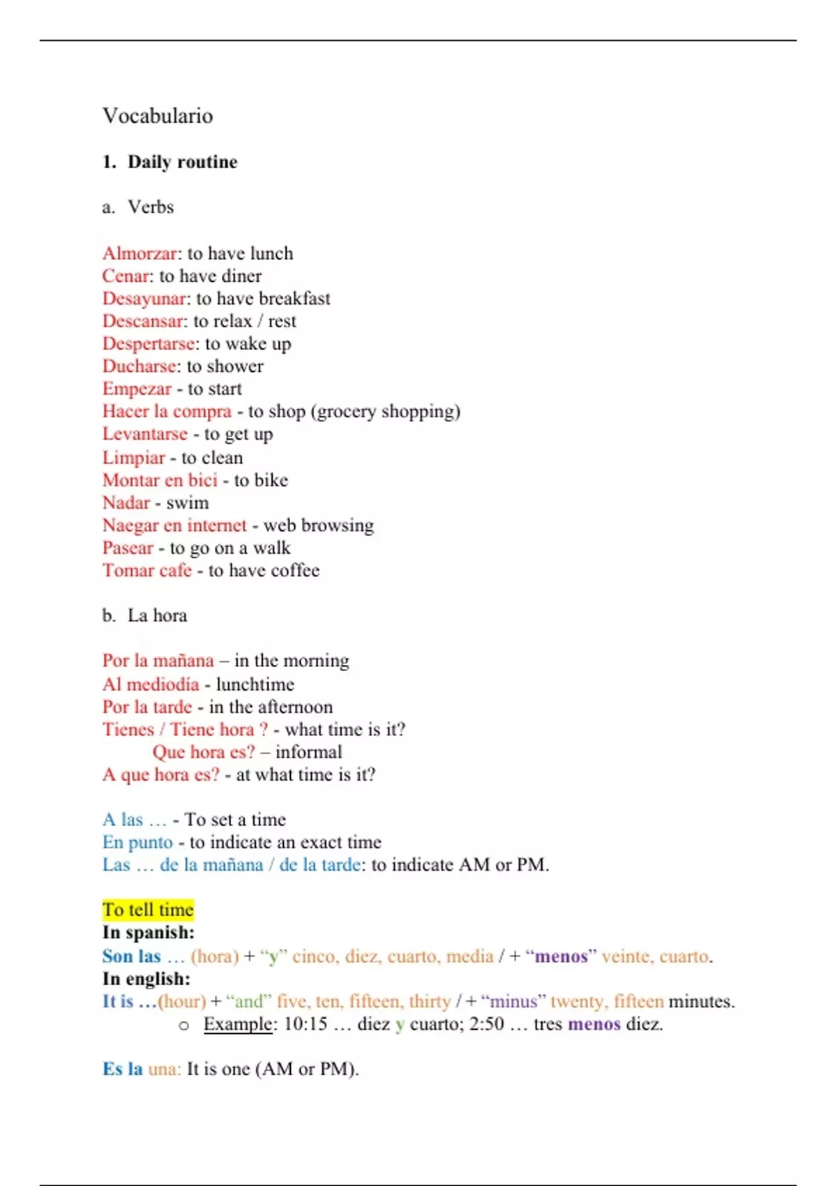 Brief document on daily routine verbs and how to tell time. This will allow you to converse with others and let them know what a typical day in your life is like. For example, to say "I wake up at 9" you would say "Despierto a las nueve".