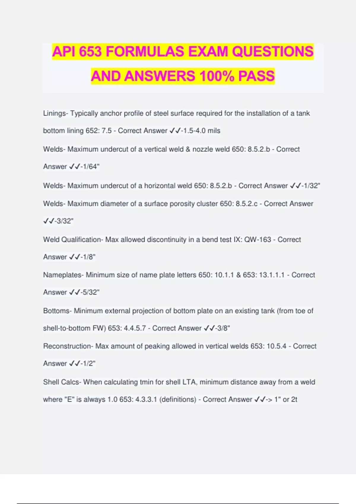 API 653 FORMULAS EXAM QUESTIONS AND ANSWERS 100% PASS Linings- Typically anchor profile of steel surface required for the installation of a tank bottom lining 652: 7.5 - Correct Answer ️️ -1.5-4.0 mils Welds- Maximum undercut of a vertical weld & nozzle weld 650: 8.5.2.b - Correct Answer ️️ -1/64" Welds- Maximum undercut of a horizontal weld 650: 8.5.2.b - Correct Answer ️️ -1/32" Welds- Maximum diameter of a surface porosity cluster 650: 8.5.2.c - Correct Answer ️️ -3/32" Weld Qualification- Max allowed discontinuity in a bend test IX: QW-163 - Correct Answer ️️ -1/8" Nameplates- Minimum size of name plate letters 650: 10.1.1 & 653: 13.1.1.1 - Correct Answer ️️ -5/32" Bottoms- Minimum external projection of bottom plate on an existing tank (from toe of shell-to-bottom FW) 653: 4.4.5.7 - Correct Answer ️️ -3/8" Reconstruction- Max amount of peaking allowed in vertical welds 653: 10.5.4 - Correct Answer ️️ -1/2" Shell Calcs- When calculating tmin for shell LTA, minimum distance away from a weld where "E" is always 1.0 653: 4.3.3.1 (definitions) - Correct Answer ️️ - 1" or 2t Shell Patch- Minimum overlap of shell lap-patch used to cover a hole (edge of hole to edge of patch) 653: 9.3.2.3 - Correct Answer ️️ -1" NDE- When performing a PT examination, minimum distance to clean beyond the area to be examined V: T-642.b - Correct Answer ️️ -1" NDE- When performing a MT examination, minimum distance to clean beyond the area to be examined V: T-741.1.b - Correct Answer ️️ -1" Reconstruction- Maximum amount of banding allowed in a horizontal weld 653: 10.5.5 - Correct Answer ️️ -1" Bottoms- Minimum overlap required for single-welded lap joints 650: 5.1.3.5 - Correct Answer ️️ -1" Bottoms- Minimum external projection of bottom plate on a new tank 650: 5.4.2 - Correct Answer ️️ -2" Vacuum Box- Minimum overlap of previously test surfaces when using a vacuum box 650: 8.6.5 - Correct Answer ️️ -2" Bottom Patch- Minimum overlap of bottom lap-patch fillet weld to the nearest existing bottom weld 653: Fig. 9.13 - Correct Answer ️️ -2"