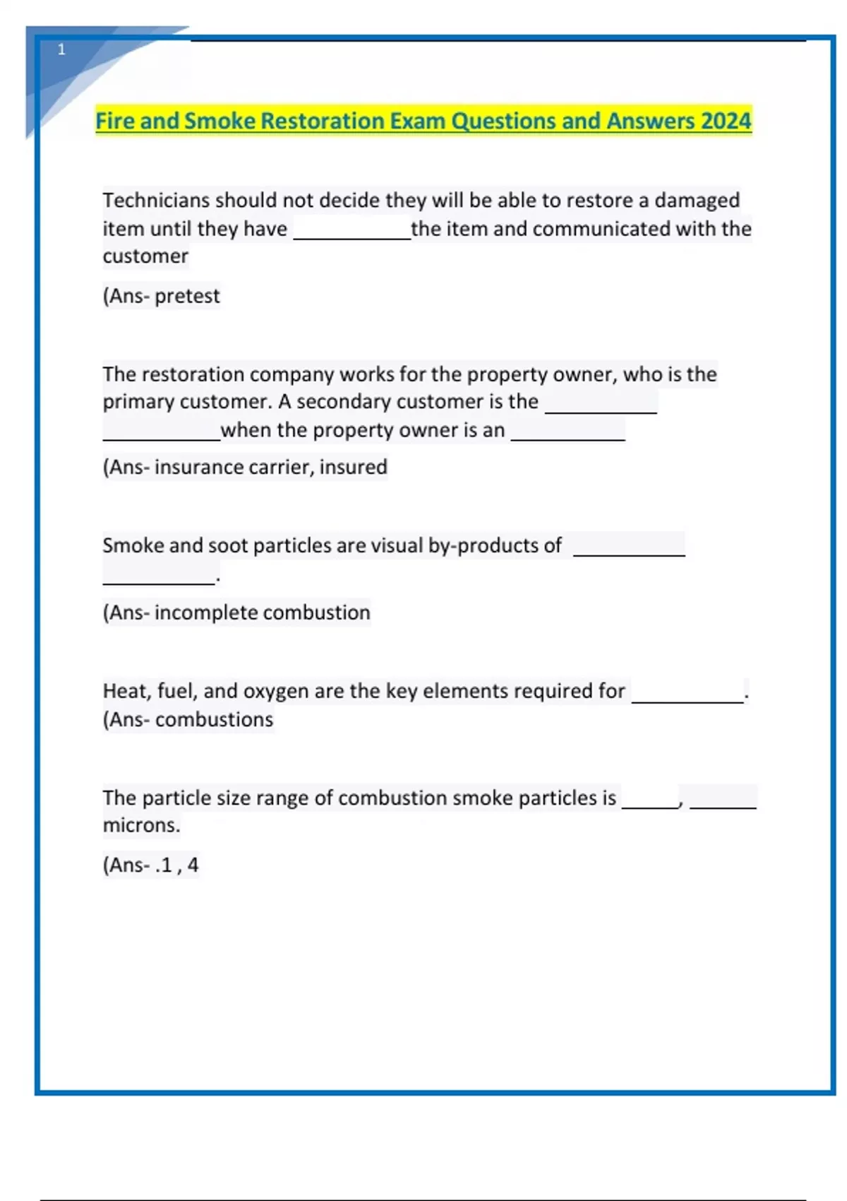 Fire and Smoke Restoration Exam Questions and Answers 2024