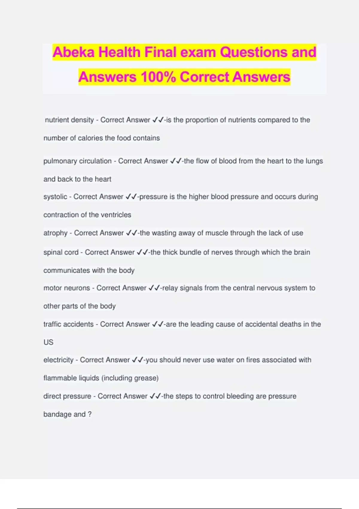 Abeka Health Final exam Questions and Answers 100% Correct Answers nutrient density - Correct Answer ️️ -is the proportion of nutrients compared to the number of calories the food contains pulmonary circulation - Correct Answer ️️ -the flow of blood from the heart to the lungs and back to the heart systolic - Correct Answer ️️ -pressure is the higher blood pressure and occurs during contraction of the ventricles atrophy - Correct Answer ️️ -the wasting away of muscle through the lack of use spinal cord - Correct Answer ️️ -the thick bundle of nerves through which the brain communicates with the body motor neurons - Correct Answer ️️ -relay signals from the central nervous system to other parts of the body traffic accidents - Correct Answer ️️ -are the leading cause of accidental deaths in the US electricity - Correct Answer ️️ -you should never use water on fires associated with flammable liquids (including grease) direct pressure - Correct Answer ️️ -the steps to control bleeding are pressure bandage and ? benign tumor - Correct Answer ️️ -shows no tendency to spread throughout the body drug - Correct Answer ️️ -a substance that alters the function of the body in some way dependence - Correct Answer ️️ -the condition in which a drug user becomes unable to function normally without a drug anesthetics - Correct Answer ️️ -medicines that cause a loss of feeling pituitary gland - Correct Answer ️️ -the endocrine gland that is sometimes called the "master gland" because it affects the other endocrine glands vitamins c and e - Correct Answer ️️ -the vitamins that function as antioxidants liver - Correct Answer ️️ -the body's largest internal organ hypothermia - Correct Answer ️️ -below-normal body temperature first aid - Correct Answer ️️ -the immediate medical attention given to a victim of an injury or sudden illness shock - Correct Answer ️️ -a life-threatening condition that can accompany almost any serious injury alternate back blows and chest compressions - Correct Answer ️️ -if an infant is choking and cannot cry, what should you do? abdominal thrusts - Correct Answer ️️ -a conscious adult who has a respiratory obstruction should be administered ? CPR - Correct Answer ️️ -an unconscious person who is not breathing should receive ? abrasions, punctures, lacerations - Correct Answer ️️ -are all types of open wounds leukocytes - Correct Answer ️️ -the cells designed to search o
