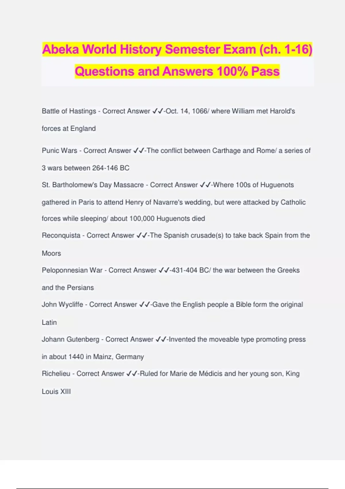 Abeka World History Semester Exam (ch. 1-16) Questions and Answers 100% Pass Battle of Hastings - Correct Answer ️️ -Oct. 14, 1066/ where William met Harold's forces at England Punic Wars - Correct Answer ️️ -The conflict between Carthage and Rome/ a series of 3 wars between 264-146 BC St. Bartholomew's Day Massacre - Correct Answer ️️ -Where 100s of Huguenots gathered in Paris to attend Henry of Navarre's wedding, but were attacked by Catholic forces while sleeping/ about 100,000 Huguenots died Reconquista - Correct Answer ️️ -The Spanish crusade(s) to take back Spain from the Moors Peloponnesian War - Correct Answer ️️ -431-404 BC/ the war between the Greeks and the Persians John Wycliffe - Correct Answer ️️ -Gave the English people a Bible form the original Latin Johann Gutenberg - Correct Answer ️️ -Invented the moveable type promoting press in about 1440 in Mainz, Germany Richelieu - Correct Answer ️️ -Ruled for Marie de Médicis and her young son, King Louis XIII Cyrus - Correct Answer ️️ -One of the most remarkable men in world history/ God called him "My shepherd" and "My anointed" Canute the Dane - Correct Answer ️️ -The Viking king of England Johannes Kepler - Correct Answer ️️ -Discovered the 3 laws of planetary motion Henry VIII - Correct Answer ️️ -Was king during the time of Martin Luther's Ninety- five Theses/ one of the worst kings in English history John Huss - Correct Answer ️️ -Stressed the Bible as the only true authority for Christians and that only God (not priests) could forgive sins and give salvation Tertullian - Correct Answer ️️ -An early church father that was martyred for the faith John Knox - Correct Answer ️️ -The outstanding leader of the Scottish Reformation Desiderius Erasmus - Correct Answer ️️ -The most famous figure of the Northern Renaissance/ published the first printed English edition of the New Testament in the original Greek Gaspard de Coligny - Correct Answer ️️ -A Protestant leader who previously won fame as a military leader Hatshepsut - Correct Answer ️️ -A female pharaoh/ possibly Moses' mother Hannibal - Correct Answer ️️ -Famous for his elephants he ride into the second Punic War with/ a famed Carthaginian general Homer - Correct Answer ️️ -Write The Iliad and The Odyssey William of Orange - Correct Answer ️️ -Leader of the repressed Dutch patriots/ "Father of Dutch liberties" Pedro Cabral - Correct Answer ️️ -Discovered Brazil Johann Eck - Correct Answer ️️ -Debated Luther at Leipzig Alexander the Great - Correct Answer ️️ -Conquered the Persian Empire while ruling Macedonia Hammurabi - Correct Answer ️️ -Brought most of the Mesopotamia under Babylonian rule and the Old Babylonian Empire was established Miguel de Cervantes - Correct Answer ️️ -Write Don Quixote Michelangelo - Correct Answer ️️ -May have been one o the greatest artists of the Renaissance, perhaps of all time/ painted the Sistine Chapel and sculpted David and Moses Genghis Khan - Correct Answer ️️ -Founder of the Mogul Empire Ignatius Loyola - Correct Answer ️️ -Started the Jesiuts Herodotus - Correct Answer ️️ -Greek "Father of History" King John - Correct Answer ️️ -Most hated king of England/ signed the Magna Carta in 1215 Gregory 1 - Correct Answer ️️ -First midieval pope Gustavus Adolphus - Correct Answer ️️ -Defeated General Tilly's army in 1631/ was killed at the Battle of Lützen John Foxe - Correct Answer ️️ -Wrote the classic "Foxe's Book of Martyrs" Nimrod - Correct Answer ️️ -Builder of the first world empire Mansa Musa - Correct Answer ️️ -The greatest ruler of the Mali Empire Mary Tudor - Correct Answer ️️ -"Bloody ________"/ tortured Protestants who wouldn't recant their faith Vasco de Balboa - Correct Answer ️️ -Crosses the Isthmus of Panama and discovered the Pacific Ocean Nero - Correct Answer ️️ -The most mentally deranged and morally deprived emperor of Rome/ began the first great breakout of persecution against the New Testament church Charlemagne - Correct Answer ️️ -His empire was the largest in the Wesr since the Roman Empire of the AD 300s/ was announced in Christmas Day
