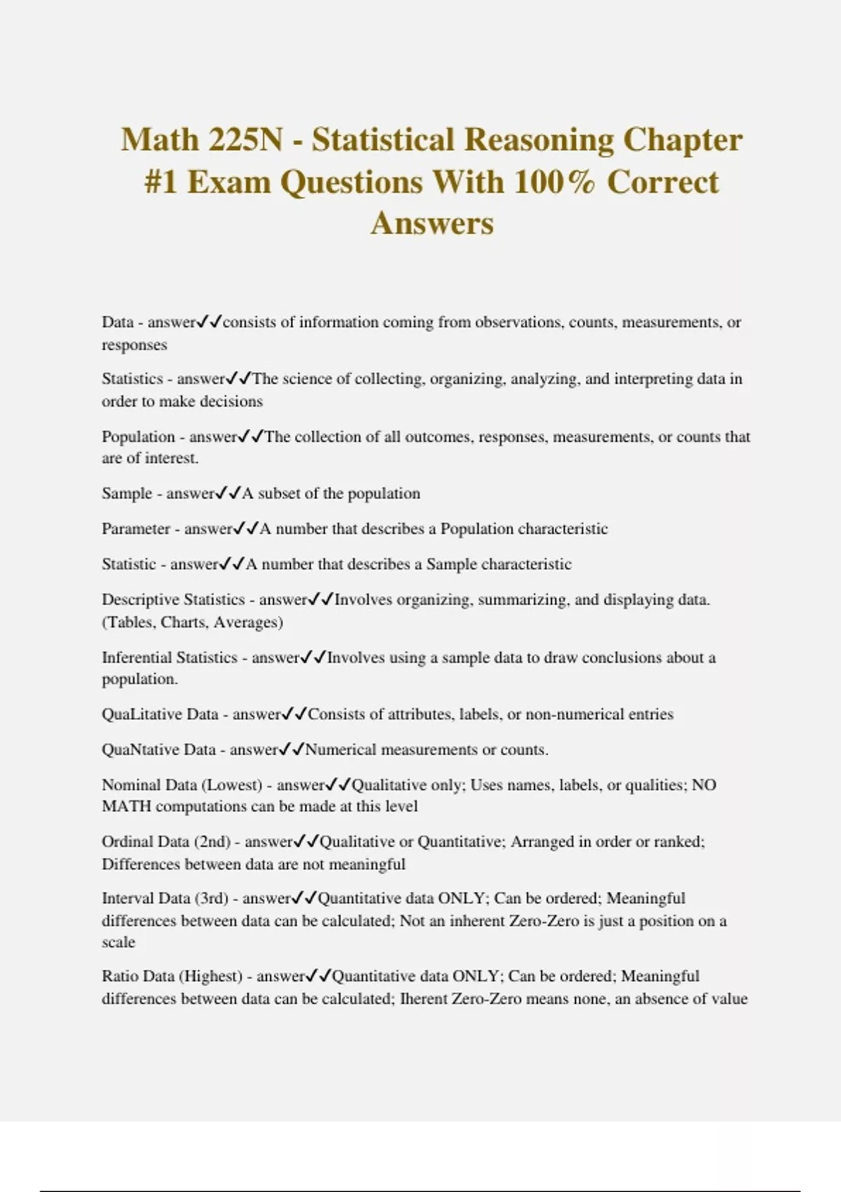 Math 225N - Statistical Reasoning Chapter #1 Exam Questions With 100% Correct Answers Data - answerconsists of information coming from observations, counts, measurements, or responses Statistics - answerThe science of collecting, organizing, analyzing, and interpreting data in order to make decisions Population - answerThe collection of all outcomes, responses, measurements, or counts that are of interest. Sample - answerA subset of the population Parameter - answerA number that describes a Population characteristic Statistic - answerA number that describes a Sample characteristic Descriptive Statistics - answerInvolves organizing, summarizing, and displaying data. (Tables, Charts, Averages) Inferential Statistics - answerInvolves using a sample data to draw conclusions about a population. QuaLitative Data - answerConsists of attributes, labels, or non-numerical entries QuaNtative Data - answerNumerical measurements or counts. Nominal Data (Lowest) - answerQualitative only; Uses names, labels, or qualities; NO MATH computations can be made at this level Ordinal Data (2nd) - answerQualitative or Quantitative; Arranged in order or ranked; Differences between data are not meaningful Interval Data (3rd) - answerQuantitative data ONLY; Can be ordered; Meaningful differences between data can be calculated; Not an inherent Zero-Zero is just a position on a scale Ratio Data (Highest) - answerQuantitative data ONLY; Can be ordered; Meaningful differences between data can be calc