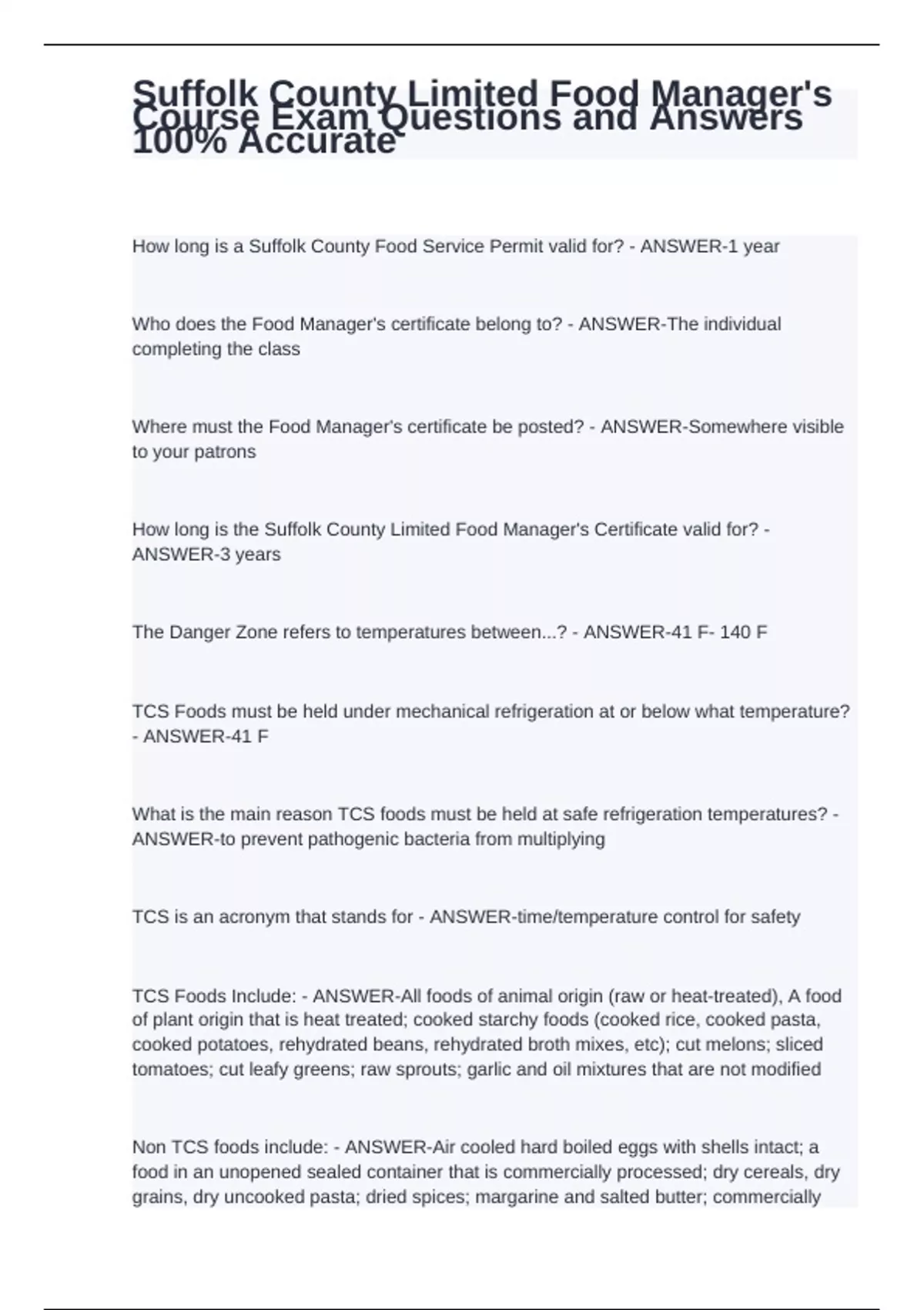 How long is a Suffolk County Food Service Permit valid for? - ANSWER-1 year Who does the Food Manager's certificate belong to? - ANSWER-The individual completing the class Where must the Food Manager's certificate be posted? - ANSWER-Somewhere visible to your patrons How long is the Suffolk County Limited Food Manager's Certificate valid for? - ANSWER-3 years The Danger Zone refers to temperatures between...? - ANSWER-41 F- 140 F TCS Foods must be held under mechanical refrigeration at or below what temperature? - ANSWER-41 F What is the main reason TCS foods must be held at safe refrigeration temperatures? - ANSWER-to prevent pathogenic bacteria from multiplying TCS is an acronym that stands for - ANSWER-time/temperature control for safety TCS Foods Include: - ANSWER-All foods of animal origin (raw or heat-treated), A food of plant origin that is heat treated; cooked starchy foods (cooked rice, cooked pasta, cooked potatoes, rehydrated beans, rehydrated broth mixes, etc); cut melons; sliced tomatoes; cut leafy greens; raw sprouts; garlic and oil mixtures that are not modified Non TCS foods include: - ANSWER-Air cooled hard boiled eggs with shells intact; a food in an unopened sealed container that is commercially processed; dry cereals, dry grains, dry uncooked pasta; dried spices; margarine and salted butter; commercially prepared mayonnaise; breads, crackers, potato chips, pretzels and muffins, jello, cookies What causes foodborne illness? - ANSWER-Bacteria, viruses, parasites, and chemical agents Infection - ANSWER-When food containing bacteria is consumed and the bacteria grow in the body and cause illness Intoxication - ANSWER-Results when the food containing bacterial toxins are consumed