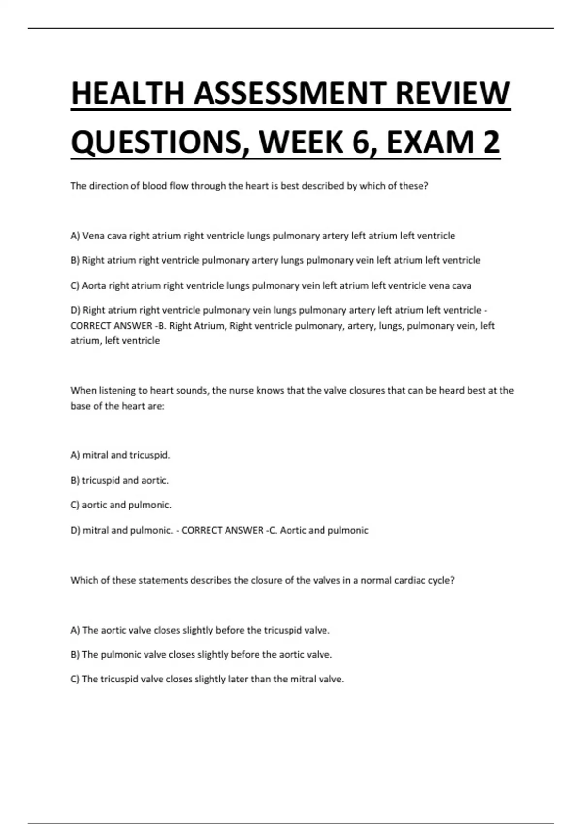 HEALTH ASSESSMENT REVIEW QUESTIONS, WEEK 6, EXAM 2 The direction of blood flow through the heart is best described by which of these? A) Vena cava right atrium right ventricle lungs pulmonary artery left atrium left ventricle B) Right atrium right ventricle pulmonary artery lungs pulmonary vein left atrium left ventricle C) Aorta right atrium right ventricle lungs pulmonary vein left atrium left ventricle vena cava D) Right atrium right ventricle pulmonary vein lungs pulmonary artery left atrium left ventricle - CORRECT ANSWER -B. Right Atrium, Right ventricle pulmonary, artery, lungs, pulmonary vein, left atrium, left ventricle When listening to heart sounds, the nurse knows that the valve closures that can be heard best at the base of the heart are: A) mitral and tricuspid. B) tricuspid and aortic. C) aortic and pulmonic. D) mitral and pulmonic. - CORRECT ANSWER -C. Aortic and pulmonic Which of these statements describes the closure of the valves in a normal cardiac cycle? A) The aortic valve closes slightly before the tricuspid valve. B) The pulmonic valve closes slightly before the aortic valve. C) The tricuspid valve closes slightly later than the mitral valve. D) Both the tricuspid and pulmonic valves close at the same time. - CORRECT ANSWER -C. The tricuspid valve closes slightly later than the mitral valve Tip: - CORRECT ANSWER -S1 is louder than S2 at the apex (Tricuspid and mitral valve.) S2 is louder than S1 at the base (Aortic valve and pulmonic valve.) Sounds are equal at Erb's point When you are assessing your patient's heart sounds, you notice a murmur. You listen with the bell and would describe the murmur as moderately loud and easy to hear. Which grade would you chart? A. Grade i B. Grade v C. Grade iii D. Grade vi - CORRECT ANSWER -C. Grade iii How should the nurse document mild, slight pitting edema on the ankles of a heart failure patient? A. 1+ B. 2+ C. 3+ D. 4+ - CORRECT ANSWER -A. 1+ The nurse is presenting a class on risk factors for cardiovascular disease. Which of these are considered modifiable risk factors for MI? Select all that apply. A: Ethnicity B: Abnormal lipids