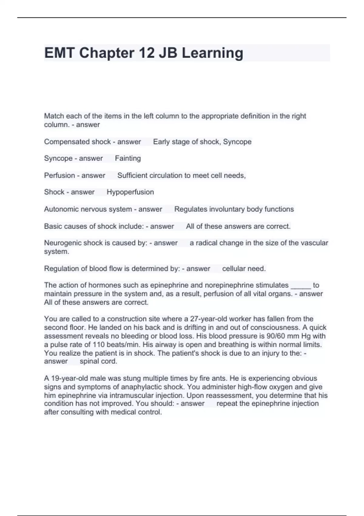 EMT Chapter 12 JB Learning Questions and Answers Graded