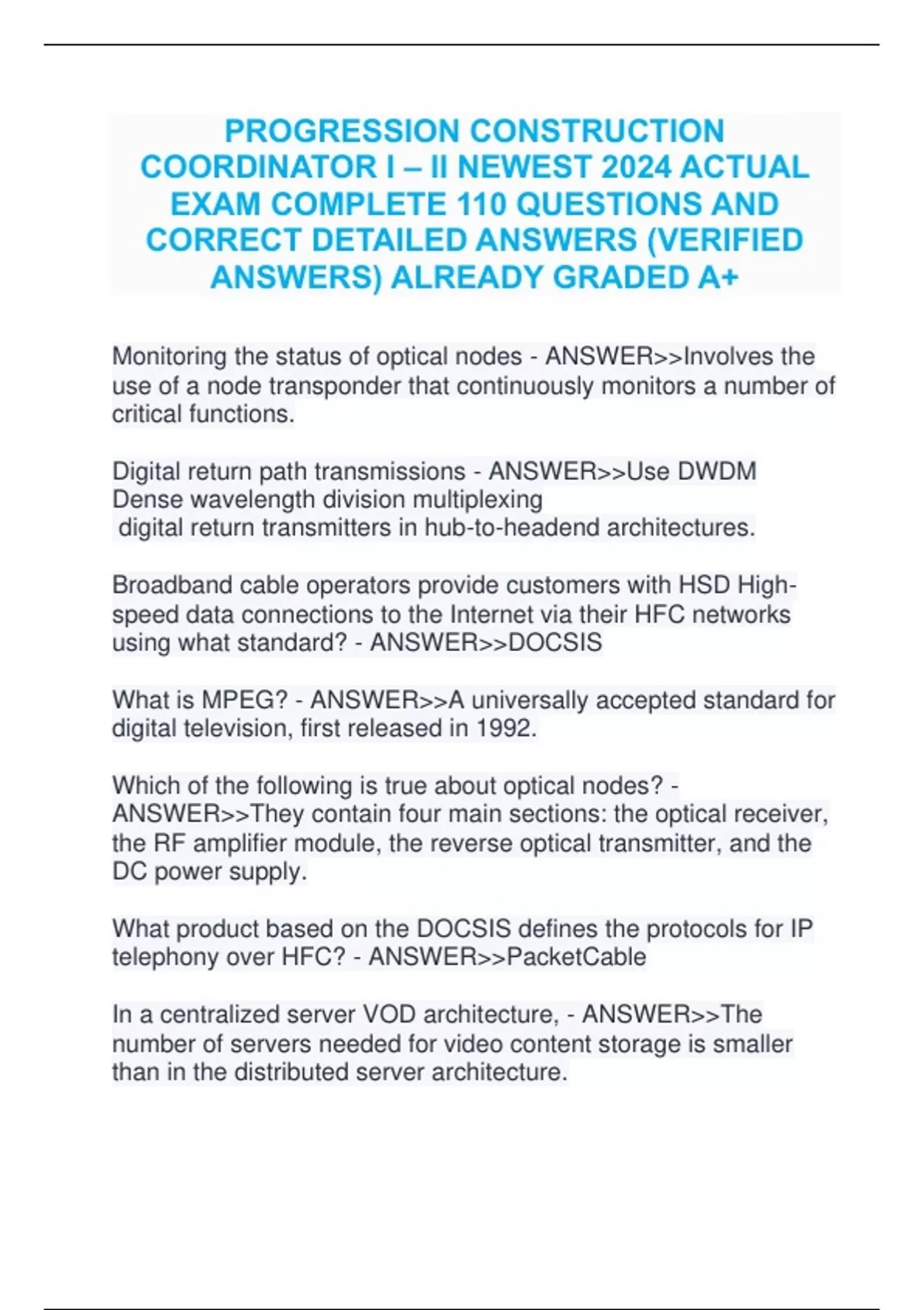 PROGRESSION CONSTRUCTION COORDINATOR I – II NEWEST 2024 ACTUAL EXAM COMPLETE 110 QUESTIONS AND CORRECT DETAILED ANSWERS (VERIFIED ANSWERS) ALREADY GRADED A+