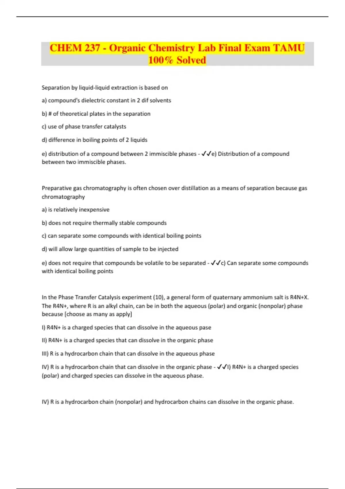 CHEM 237 - Organic Chemistry Lab Final Exam TAMU 100% Solved