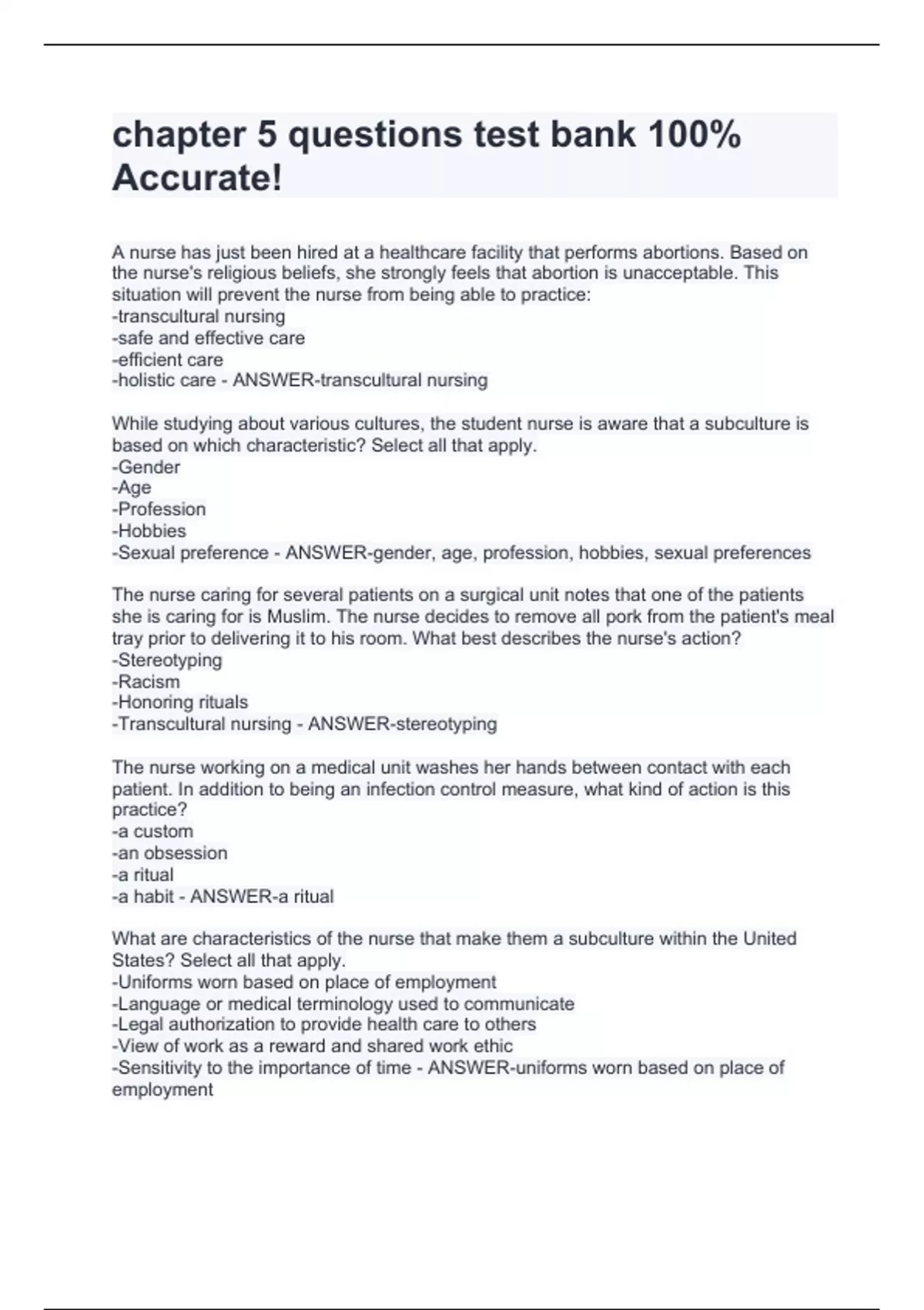 A nurse has just been hired at a healthcare facility that performs abortions. Based on the nurse's religious beliefs, she strongly feels that abortion is unacceptable. This situation will prevent the nurse from being able to practice: -transcultural nursing -safe and effective care -efficient care -holistic care - ANSWER-transcultural nursing While studying about various cultures, the student nurse is aware that a subculture is based on which characteristic? Select all that apply. -Gender -Age -Profession -Hobbies -Sexual preference - ANSWER-gender, age, profession, hobbies, sexual preferences The nurse caring for several patients on a surgical unit notes that one of the patients she is caring for is Muslim. The nurse decides to remove all pork from the patient's meal tray prior to delivering it to his room. What best describes the nurse's action? -Stereotyping -Racism -Honoring rituals -Transcultural nursing - ANSWER-stereotyping The nurse working on a medical unit washes her hands between contact with each patient. In addition to being an infection control measure, what kind of action is this practice? -a custom -an obsession -a ritual -a habit - ANSWER-a ritual What are characteristics of the nurse that make them a subculture within the United States? Select all that apply. -Uniforms worn based on place of employment -Language or medical terminology used to communicate -Legal authorization to provide health care to others -View of work as a reward and shared work ethic -Sensitivity to the importance of time - ANSWER-uniforms worn based on place of employment language or medical terminology used to communicate legal authorization to provide health care to others An African American patient refuses to allow any healthcare worker of Asian descent to care for him. This patient is demonstrating what practice? -ethnocentrism -racism -stereotyping -eth