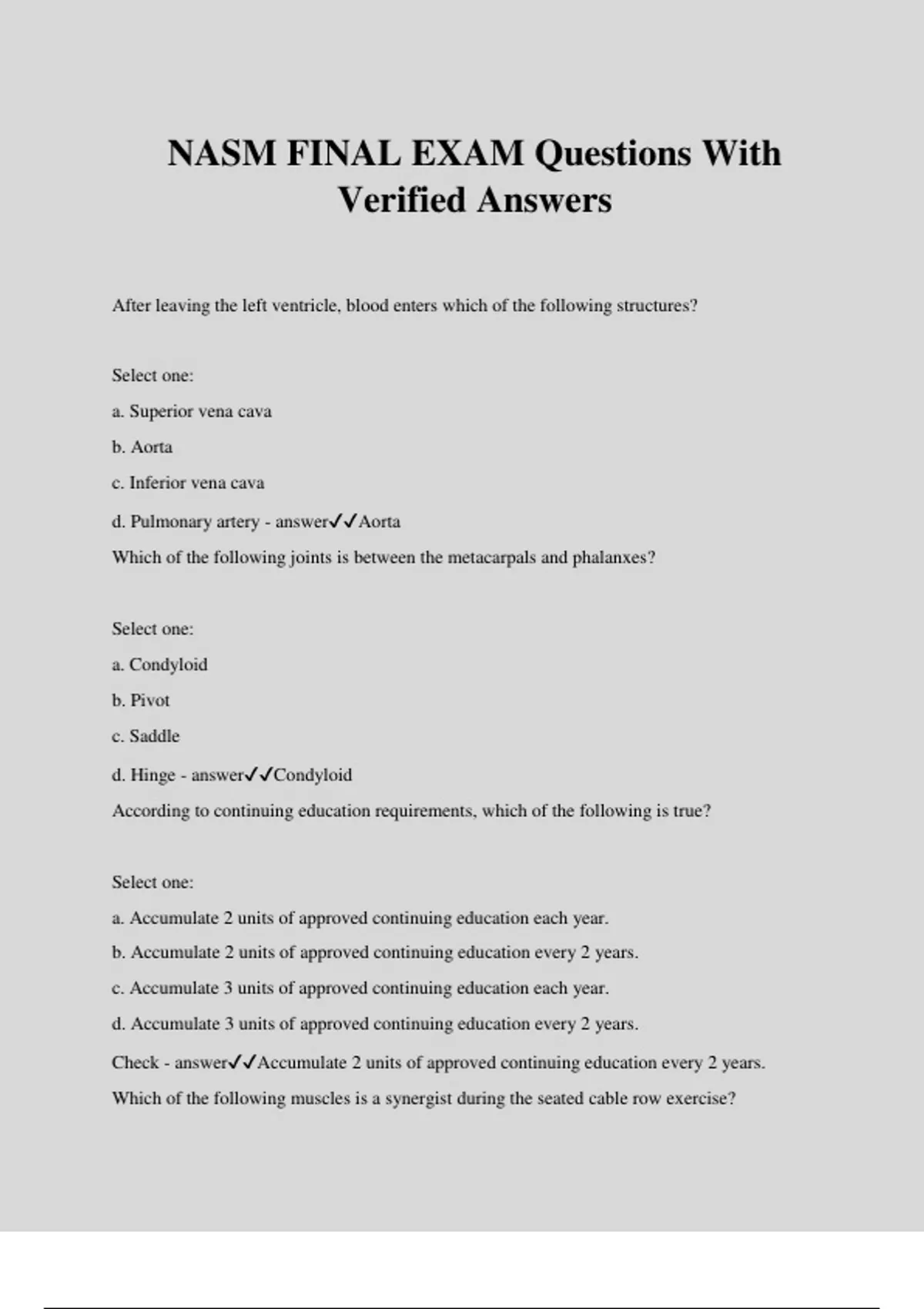 NASM FINAL EXAM Questions With Verified Answers After leaving the left ventricle, blood enters which of the following structures? Select one: a. Superior vena cava b. Aorta c. Inferior vena cava d. Pulmonary artery - answerAorta Which of the following joints is between the metacarpals and phalanxes? Select one: a. Condyloid b. Pivot c. Saddle d. Hinge - answerCondyloid According to continuing education requirements, which of the following is true? Select one: a. Accumulate 2 units of approved continuing education each year. b. Accumulate 2 units of approved continuing education every 2 years. c. Accumulate 3 units of approved continuing education each year. d. Accumulate 3 units of approved continuing education every 2 years. Check - answerAccumulate 2 units of approved continuing education every 2 years. Which of the following muscles is a synergist during the seated cable row exercise? Select one: a. Latissimus dorsi b. Pectoralis major c. Biceps brachii d. Rotator cuff - answerBiceps brachii The autonomic nervous system contains which of the following subdivisions? Select one: a. Sympathetic b. Somatic c. Peripheral d. Central - answerSympathetic Increased force output of the synergists for hip extension to compensate for the weakened gluteus maximus is an example of which of the following? Select one: a. Autogenic inhibition b. Synergistic dominance c. Davis's law d. Arthrokinetic dysfunction - answerSynergistic dominance According to the sliding filament theory, muscular contraction occurs when Select one: a. actin and myosin filaments slide away from each other. b. myosin cross bridge power strokes the actin filament across the myosin. c. the distance from Z line to Z line is increased. d. myofibrils are lengthened. - answermyosin cross bridge power strokes the actin filament across the myosin. During a 40-yard dash, the hamstring complex begins to do most of the work for a weakened gluteus maximus. This is an example of which of the following concepts? Select one: a. Force-couple relationships b. Synergistic dominance c. Length-tension relationships d. Arthrokinematic dysfunction - answerSynergistic dominance Which of the following tests should a trainer use in his cardiorespiratory assessment to determine in which heart rate training zone the training should begin? Select one: a. Shark skill test b. Davies test c. YMCA step test d. L.E.F.T. test - answerYMCA step test The Durnin-Womersley formula's four sites of skinfold measurement include which of the following anatomic locations? Select one: a. Biceps, triceps, subscapular, and iliac crest b. Chest, midaxillary, abdominal, and thigh c. Calf, gluteal, adductor, and oblique d. Supraspinale, anterior deltoid, thoracolumbar fascia, and hamstring Check - answerBiceps, triceps, subscapular, and iliac crest The Physical Activity Readiness Questionnaire (PAR-Q) is primarily aimed at identifying an individual's