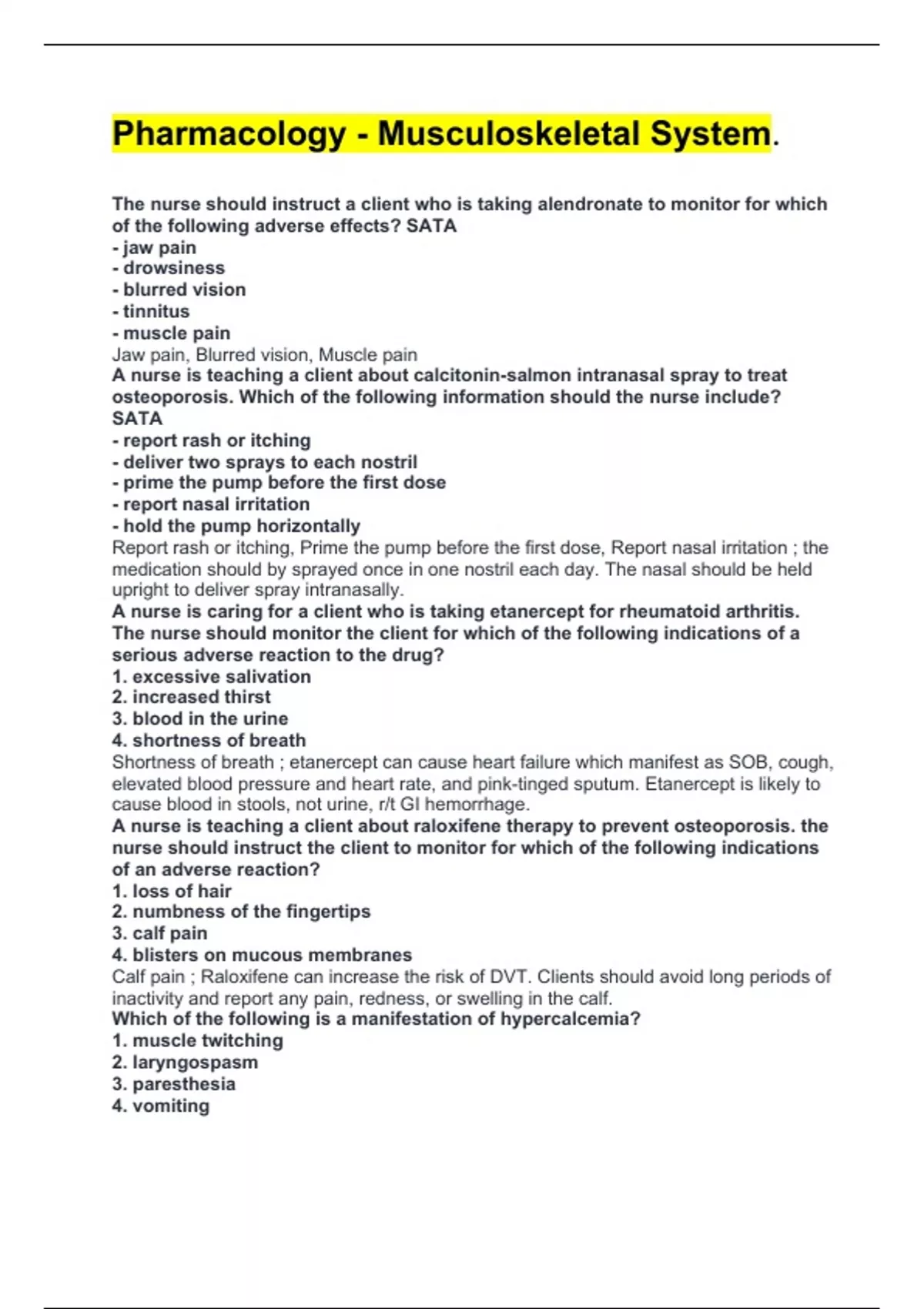 Pharmacology - Musculoskeletal System. The nurse should instruct a client who is taking alendronate to monitor for which of the following adverse effects? SATA - jaw pain - drowsiness - blurred vision - tinnitus - muscle pain Jaw pain, Blurred vision, Muscle pain A nurse is teaching a client about calcitonin-salmon intranasal spray to treat osteoporosis. Which of the following information should the nurse include? SATA - report rash or itching - deliver two sprays to each nostril - prime the pump before the first dose - report nasal irritation - hold the pump horizontally Report rash or itching, Prime the pump before the first dose, Report nasal irritation ; the medication should by sprayed once in one nostril each day. The nasal should be held upright to deliver spray intranasally. A nurse is caring for a client who is taking etanercept for rheumatoid arthritis. The nurse should monitor the client for which of the following indications of a serious adverse reaction to the drug? 1. excessive salivation 2. increased thirst 3. blood in the urine 4. shortness of breath Shortness of breath ; etanercept can cause heart failure which manifest as SOB, cough, elevated blood pressure and heart rate, and pink-tinged sputum. Etanercept is likely to cause blood in stools, not urine, r/t GI hemorrhage. A nurse is teaching a client about raloxifene therapy to prevent osteoporosis. the nurse should instruct the client to monitor for which of the following indications of an adverse reaction? 1. loss of hair 2. numbness of the fingertips 3. calf pain 4. blisters on mucous membranes Calf pain ; Raloxifene can increase the risk of DVT. Clients should avoid long periods of inactivity and report any pain, redness, or swelling in the calf. Which of the following is a manifestation of hypercalcemia? 1. muscle twitching 2. laryngospasm 3. paresthesia 4. vomiting Vomiting ; other manifestations of hypercalcemia include nausea, vomiting, flank pain, lethargy, and deep bone pain. The nurse should explain that alendronate increases bone mass by which of the following actions? 1. decreases activity of osteoclasts 2. increases calcium excretion 3. promotes intestinal absorption of calcium and phosphorus 4. reduces action of osteoblasts Decreas