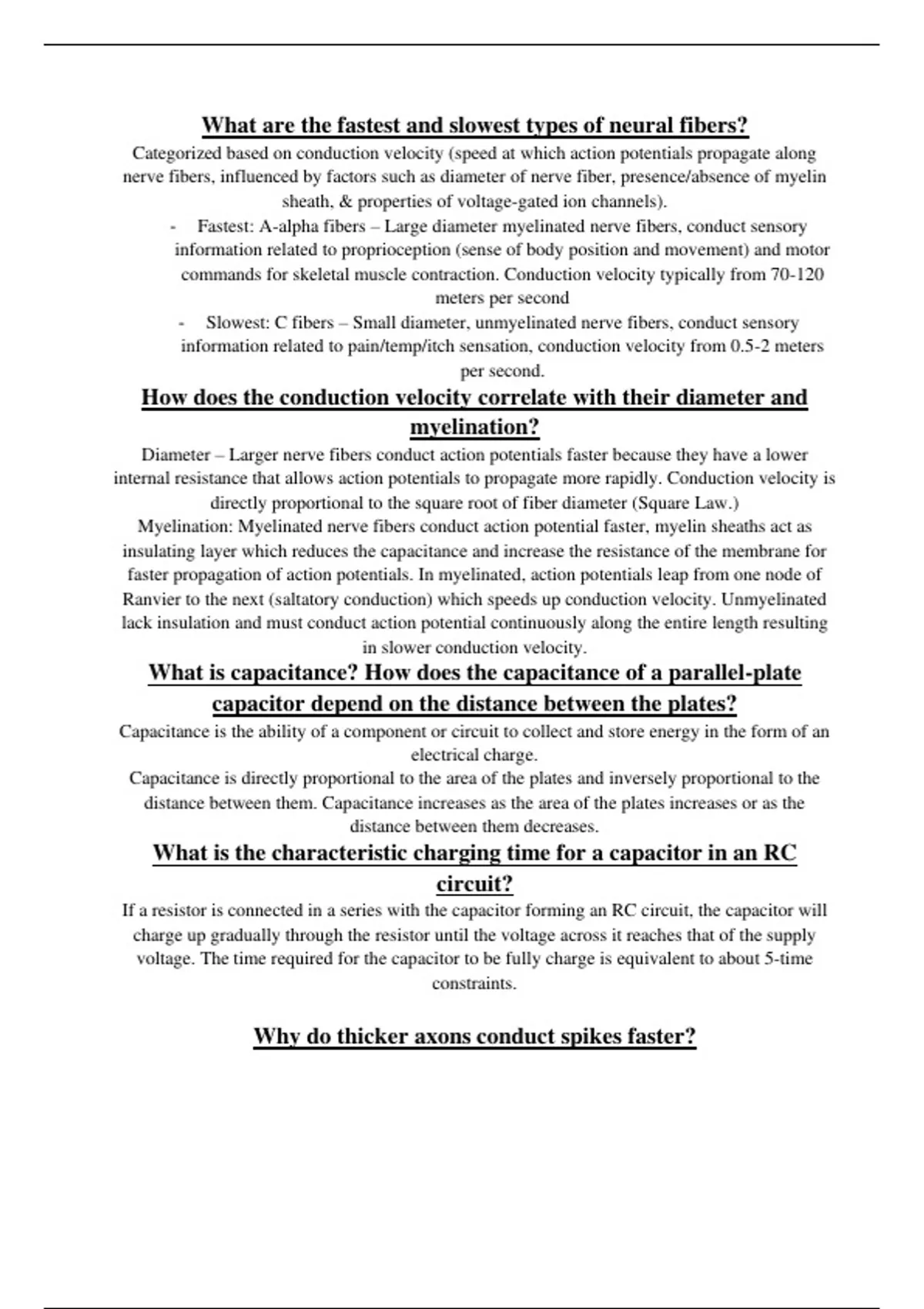 This study guide covers key concepts in neural transmission and synaptic function, focusing on the properties and types of neural fibers, mechanisms of action potential conduction, and the structure and function of synapses. It explains the correlation between nerve fiber diameter, myelination, and conduction velocity and delves into the role of capacitance in neural transmission. The guide also explores neurotransmitter types, their effects on membrane potential, and the molecular mechanisms involved in synaptic vesicle cycling, including the roles of clathrin and dynamin.