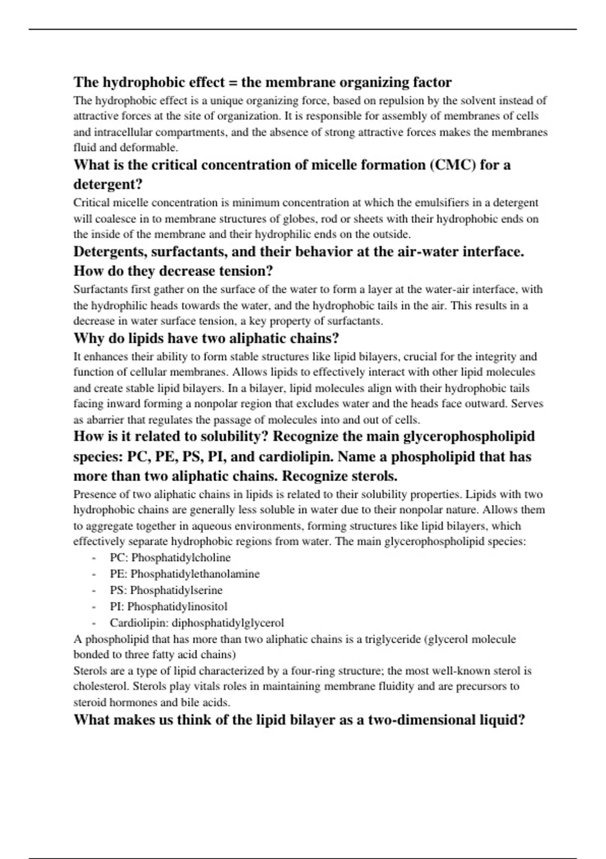 This study guide provides an in-depth overview of membrane biology, focusing on the hydrophobic effect as a key organizing factor, critical micelle concentration, the behavior of detergents and surfactants, and the structural features of lipids and proteins in membranes. It covers essential topics such as the composition and dynamics of lipid bilayers, the distribution of water and major zones within bilayers, and the unique adaptations of extremophiles. Additionally, it explains the significance of lipid asymmetry, the roles of different membrane proteins, and the interpretation of hydropathy profiles for multi-pass alpha-helical proteins.