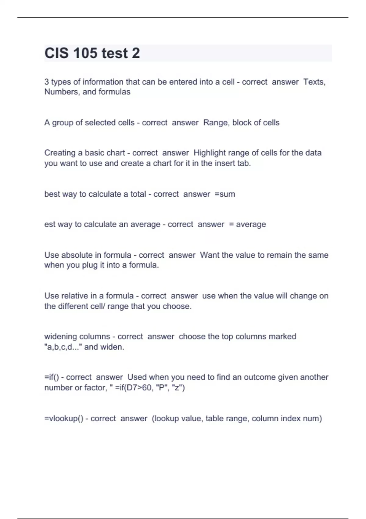 CIS 105 test 2 Arizona State University - Question and answers verified to pass CIS 105 test 2 3 types of information that can be entered into a cell - correct answer Texts, Numbers, and formulas A group of selected cells - correct answer Range, block of cells Creating a basic chart - correct answer Highlight range of cells for the data you want to use and create a chart for it in the insert tab. best way to calculate a total - correct answer =sum est way to calculate an average - correct answer = average Use absolute in formula - correct answer Want the value to remain the same when you plug it into a formula. Use relative in a formula - correct answer use when the value will change on the different cell/ range that you choose. widening columns - correct answer choose the top columns marked "a,b,c,d..." and widen. =if() - correct answer Used when you need to find an outcome given another number or factor, " =if(D7>60, "P", "z") =vlookup() - correc