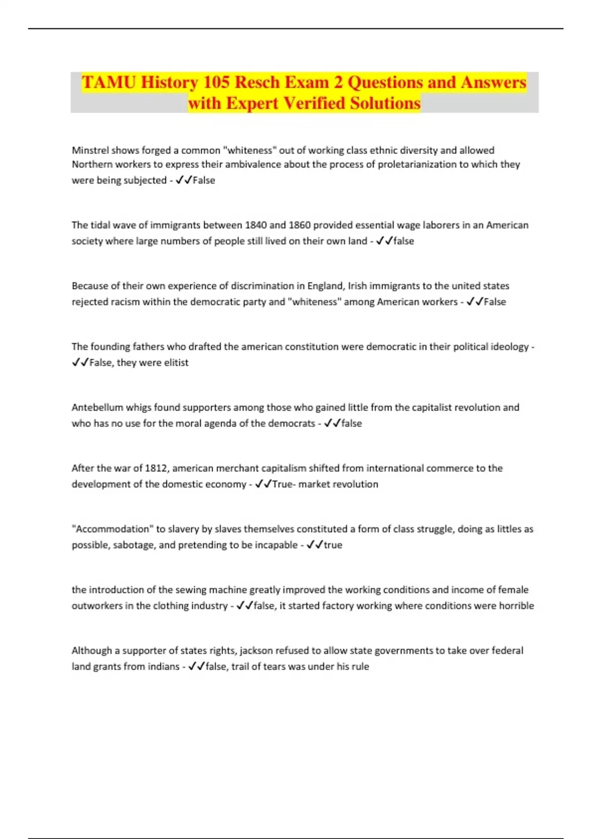 TAMU History 105 Resch Exam 2 Questions and Answers with Expert Verified Solutions