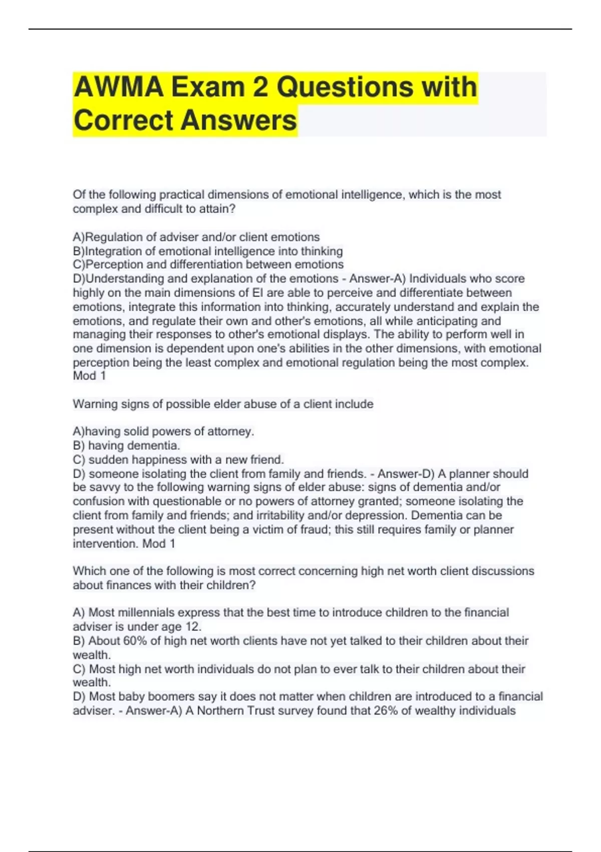 AWMA Exam 2 Questions with Correct Answers (2) Of the following practical dimensions of emotional intelligence, which is the most complex and difficult to attain? A)Regulation of adviser and/or client emotions B)Integration of emotional intelligence into thinking C)Perception and differentiation between emotions D)Understanding and explanation of the emotions - Answer-A) Individuals who score highly on the main dimensions of EI are able to perceive and differentiate between emotions, integrate this information into thinking, accurately understand and explain the emotions, and regulate their own and other's emotions, all while anticipating and managing their responses to other's emotional displays. The ability to perform well in one dimension is dependent upon one's abilities in the other dimensions, with emotional perception being the least complex and emotional regulation being the most complex. Mod 1 Warning signs of possible elder abuse of a client include A)having solid powers of attorney. B) having dementia. C) sudden happiness with a new friend. D) someone isolating the client from family and friends. - Answer-D) A planner should be savvy to the following warning signs of elder abuse: signs of dementia and/or confusion with questionable or no powers of attorney granted; someone isolating the client from family and friends; and irritability and/or depression. Dementia can be present without the client being a victim of fraud; this still requires family or planner intervention. Mod 1 Which one of the following is most correct concerning high net worth client discussions about finances with their children? A) Most millennials express that the best time to introduce children to the financial adviser is under age 12. B) About 60% of high net worth clients have not yet talked to their children about their wealth. C) Most high net worth individuals do not plan to ever talk to their children about their wealth. D) Most baby boomers say it does not matter when children are introduced to a financial adviser. - Answer-A) A Northern Trust survey found that 26% of wealthy individuals have not yet talked to their children about wealth and some (not most) do not plan to ever do so. A Spectrem study shows that 54% of millennials say that under age 12 is the best age to introduce a financial planner. Considering the average of all demographic categories, and that of baby boomers, the ages 18 to 25 group was found to be the ideal time to introduce a financial adviser. Mod 1 Which one of the following is most important in establishing trust with a client? A) Being associated with a good financial company B)Having a pleasant manner C) Demonstrating professional knowledge D) Being genuine and following best practices - Answer-D) Being genuine and following best practices are two of the most important factors in establishing trust with a client. Mod 1 Which one of the following is a question that a wealth adviser could best pose to clients when starting a conversation about family matters? A) Do you exclude family members from learning about or participating in decisions related to the family's business or wealth? B) Do you fight when the family communicates about wealth matters? C)Are there any major transitions that are important? D)What steps has the family taken to ensure that family members are financially fluent and well positioned to serve as responsible stewards of wealth? - Answer-D) When starting a discourse with a wealthy client, the questions about family matters should be open-ended and not leading clients to answer a certain way. Mod 1 Which one of the following is a regulation that allows members to put a temporary hold on disbursements from an elder account if elder abuse is suspected? A)Elder Justice Initiative B) FINRA Rule 4512 C) FINRA Rule 2165 D) Senior Safe Act - Answer-C) FINRA Rule 2165 goes beyond the Senior Safe Act in not only detecting financial abuse, but allowing an adviser to put a temporary hold (up to 25 days) on disbursements from an elder account (over 65) if financial abuse is suspected to be present or commencing. FINRA Rule 4512 requires financial advisers to make a "reasonable effort" to collect the name of a "trusted contact person." The Elder Justice Initiative supports and coordinates the Department of Justice's enforcement and programmatic efforts to combat elder abuse, neglect, and financial fraud and scams. Mod 1 When the personal circumstances of a client change, to which wealth management step does the investment professional return? A) Data gathering and goal establishment B) Analyzing and evaluating the client's financial status C)Monitoring financial planning recommendations D)Implementing financial planning recommendations - Answer-A) In Step 2 of the wealth adviser financial planning process, advisers discover client goals and gather financial data about the client. If there is a major event in the client's life, then planners should come back to this goal-setting, data-gathering step. Mod 1 Compared to those planners working alone, advisers working with a team generally have A)more assets under management but less revenue. B)more assets under management and more revenue. C) fewer assets under management but more revenue. D)fewer assets under management and less revenue. - Answer-B) Teamwork is a bonus for advisers, who, when compared to sole practitioners, generally have deeper client relationships, generate more assets and revenue, have lower attrition, and have a higher fee-based ratio. Mod 1