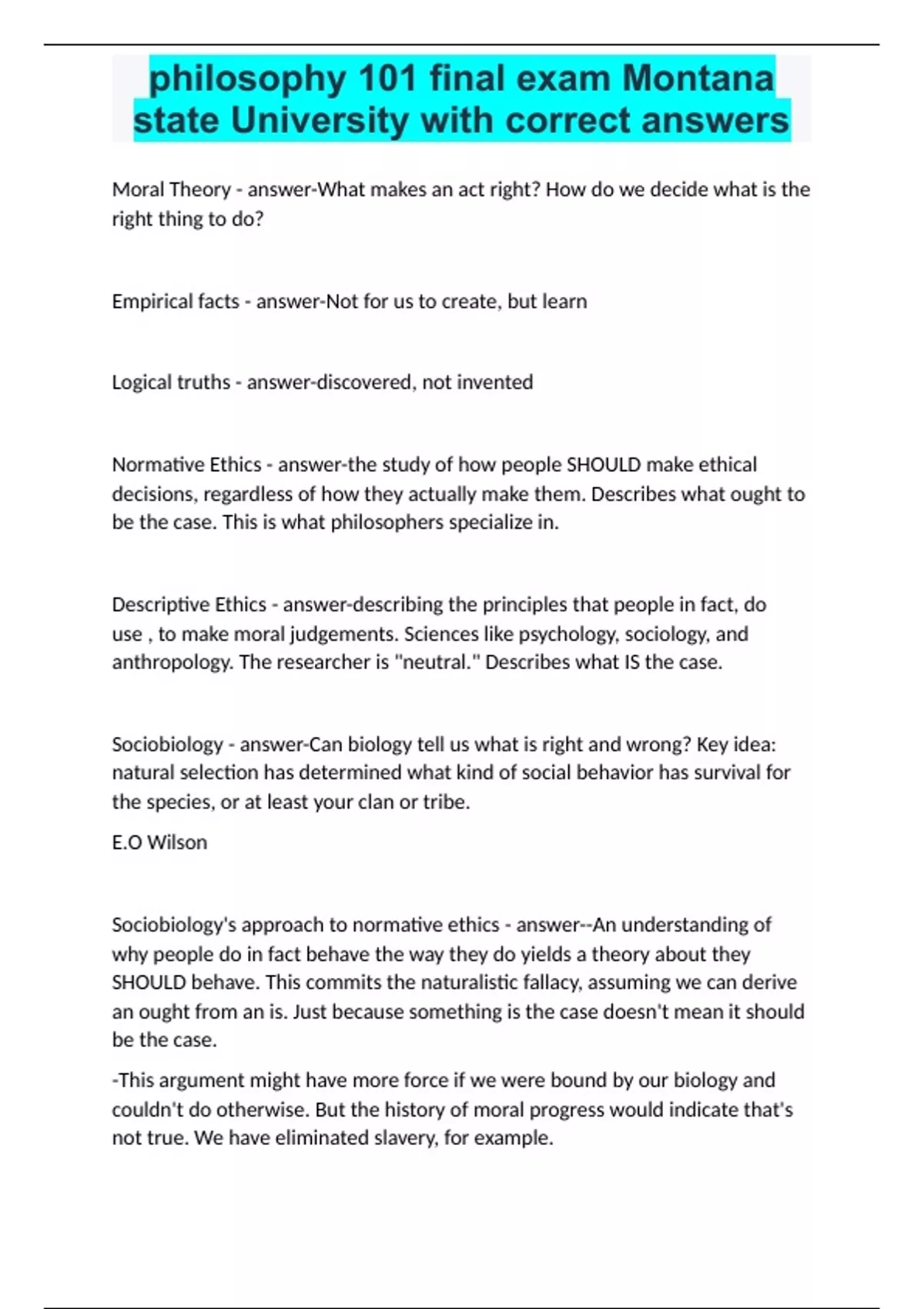 Moral Theory - answer-What makes an act right? How do we decide what is the right thing to do? Empirical facts - answer-Not for us to create, but learn Logical truths - answer-discovered, not invented Normative Ethics - answer-the study of how people SHOULD make ethical decisions, regardless of how they actually make them. Describes what ought to be the case. This is what philosophers specialize in. Descriptive Ethics - answer-describing the principles that people in fact, do use , to make moral judgements. Sciences like psychology, sociology, and anthropology. The researcher is "neutral." Describes what IS the case. Sociobiology - answer-Can biology tell us what is right and wrong? Key idea: natural selection has determined what kind of social behavior has survival for the species, or at least your clan or tribe. E.O Wilson Sociobiology's approach to normative ethics - answer--An understanding of why people do in fact behave the way they do yields a theory about they SHOULD behave. This commits the naturalistic fallacy, assuming we can derive an ought from an is. Just because something is the case doesn't mean it should be the case. -This argument might have more force if we were bound by our biology and couldn't do otherwise. But the history of moral progress would indicate that's not true. We have eliminated slavery, for example. Emotivism - answer--the doctrine that moral utterances are simply expressions of emotions, and have no truth value , for they are not making any real claims about the world. -For example, saying cheating on a test is wrong is actually equivalent to saying, "cheating? Boo" -The theory of meaning that generated it was the verifiability theory of meaning popular in the mid part of the 20th century, championed by a school of thought called logical positivism: if a sentence cannot be verified (if there is no way to determine what would make it true or false), then it is cognitively meaningless-- that is, neither true nor false. Criticisms of Emotivism - answer--can't account for any real moral disagreements, which flies in the face of common sense. Saying Hitler was wrong to murder 6 million Jews means more than just "Hitler-Boo" -If this theory is correct, then we can't condemn something like torturing innocent children as genuinely wrong. But is it right? -Common sense can be wrong, but you need good reasons to reject it. Emotivism does not offer any. Objection to using a moral code to decide right from wrong - answer-they can offer guidance, but they can't function as full blown theories of what makes an act right or wrong, for they are often too general or specific to solve a moral problem, and they can offer conflicting advice. -What if my parents tell me to steal? What if the only way to save a bunch of people is to kill one? "Bizarre consequences" of individual realism - answer--you can never be wrong, (assuming you fully know the situation and have thought it through). -You are morally infallible by definition. -You make an action right simply by agreeing with it. -Moral disagreement is reduced to persuasion and matters of opinion, nothing objective. Most importantly, if taken to its logical conclusion, it leads to judgements no one would accept. Ex; if Hitler thought what murdering Jews was right , then it was right for him. Individual realsim - answer-nothing is ultimately right or wrong, depends on the individual. Whenever someone says an action is right, what that means is, it is right for them. Divine Command Theory - answer-Morally right actions are those decreed by God. What makes an action right is that God approves of it. God created morality. No God, no morality. Complications for Divine Command theory - answer--Would seem to imply that morality has an inescapable arbitrary element to it. -If God had decreed that murder was OK, then it would be? -On the other hand, if murder is wrong regardless of what God says, then God must not be the ultimate creator of morality (though he may be the ultimate enforcer). -Even if there is no God, isn't murder still wrong? Would imply morality ultimately does not rest on there being a supernatural being. cultural relativism - answer-- more sophisticated and progressive kind of moral relativism. -Moral rights and wrongs are relative to a culture (or even a subgroup in a society). Virtues of Cultural Relativism - answer--Promotes tolerance and acceptance of differences, leading to more empathy and compassion. Diffuses belief in the superiority of one's way of doing things. -Counteracts black and white thinking, us vs. them. Good antidote to ethnocentrism. Encourages us to try to understand a culture's beliefs and practices from within that culture's point of view. Challenges to Cultural Relativism - answer--Would seem to deny universal moral truths. Isn't sex trafficking of children wrong, no matter what? Isn't female genital surgery wrong, no matter what? -What about the notion of universal human rights? -How can we claim the world has made moral progress, in things like outlawing slavery, giving women the right to vote, protecting workers, etc? How to solve the problem of Cultural Relativism? - answer--Cultural practices are not the same thing as moral judgements. We need to understand the larger context within which the practice occurs. -Cross cultural moral-disagreements may not lie in moral principles, but in the factual beliefs. -Moral standard + factual beliefs= moral judgement -Perhaps everyone believes equals should be treated equally, but we disagree on what constitutes being equal. What differs are our views about the nature of reality, not the nature of morality. Consequentialism - answer--an ethical theory that judges the rightness or wrongness of an action in terms of its consequences. -seek to maximize "intrinsic value", things that are valuable for their own sake. -Also called teleological theories -the consequences sought after are typically non-moral goods, such as happiness, or pleasure (things 