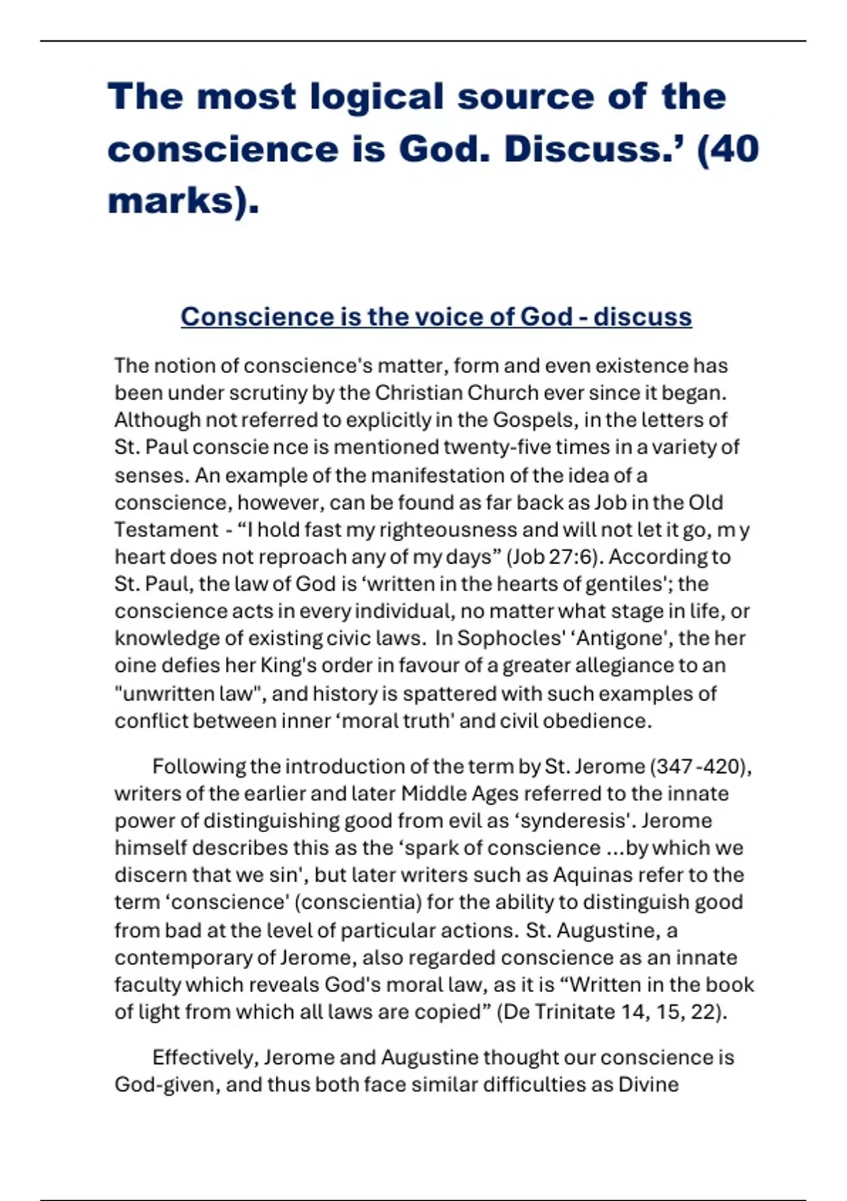 he most logical source of the conscience is God. Discuss.’ (40 marks). Conscience is the voice of God - discuss The notion of conscience's matter, form and even existence has been under scrutiny by the Christian Church ever since it began. Although not referred to explicitly in the Gospels, in the letters of St. Paul conscie nce is mentioned twenty-five times in a variety of senses. An example of the manifestation of the idea of a conscience, however, can be found as far back as Job in the Old Testament - “I hold fast my righteousness and will not let it go, m y heart does not reproach any of my days” (Job 27:6). According to St. Paul, the law of God is ‘written in the hearts of gentiles'; the conscience acts in every individual, no matter what stage in life, or knowledge of existing civic laws. In Sophocles' ‘Antigone', the her oine defies her King's order in favour of a greater allegiance to an "unwritten law", and history is spattered with such examples of conflict between inner ‘moral truth' and civil obedience. Following the introduction of the term by St. Jerome (347 -420), writers of the earlier and later Middle Ages referred to the innate power of distinguishing good from evil as ‘synderesis'. Jerome himself describes this as the ‘spark of conscience ...by which we discern that we sin', but later writers such as Aquinas refer to the term ‘conscience' (conscientia) for the ability to distinguish good from bad at the level of particular actions. St. Augustine, a contemporary of Jerome, also regarded conscience as an innate faculty which reveals God's moral law, as it is “Written in the book of light from which all laws are copied” (De Trinitate 14, 15, 22). Effectively, Jerome and Augustine thought our conscience is God-given, and thus both face similar difficulties as Divine Command theory. Arguably, Augustine and Jerome believe the capability of reason to be far greater than it really is. The Aristotelian line of thought differs from Plato's in a subtle but important way, that although reason is innate and universal, it needs to be used to arrive at an understanding of right and wrong. Augustine doesn't ‘use' reason; he views knowledge of right and wrong as intuitive and automatic, which is problematic. First, the idea of moral relativism becomes more convincing as historical and social enquiry lends us more information about other cultures, and although it does not deny Aristotle's universal reason, it does deny a universal understanding of right and wrong. In addition, if God had said that rape, murder and torture are desirable values, then they would have been. This begins the series of problems presented by Plato's Euthyphro dilemma, which affects all theories claiming God's word as the dictate of right and wrong. Pelagius, an ascetic monk, recognised that humans have the capacity to decide whether or not to follow the good. Even if one knew something was wrong, such as torture of an innocent child, one still has the potential to carry it out. However, in the Biblical tradition, God's grace does not necessarily drive people to the right action (we would have a very different picture of Christian morality if it was believed that it does) but instead, in Ephesians, “The forgiveness of sins, in accordance with the riches of God's grace”. Conscience may be the voice of God, therefore, but we still have the capacity to ignore it, or actively disobey it. Peter Singer poses a situation where a group of animal rights protesters are deciding whether they should break the law to stop a practice they know to be wrong. An answer to this type of question was given by the nineteenth-century American radical, Henry Thoreau. In his essay ‘Civil Disobedience', Thoreau wrote, “It is not desirable to cultivate a respect for the law, so much as for the right”. The American philosopher Henry Wolff has written in a similar vein, saying that a man should “make himself the author of his decisions”, and to resist the state who try to lay authority over him. Both Thoreau and Wolff resolve the conflict