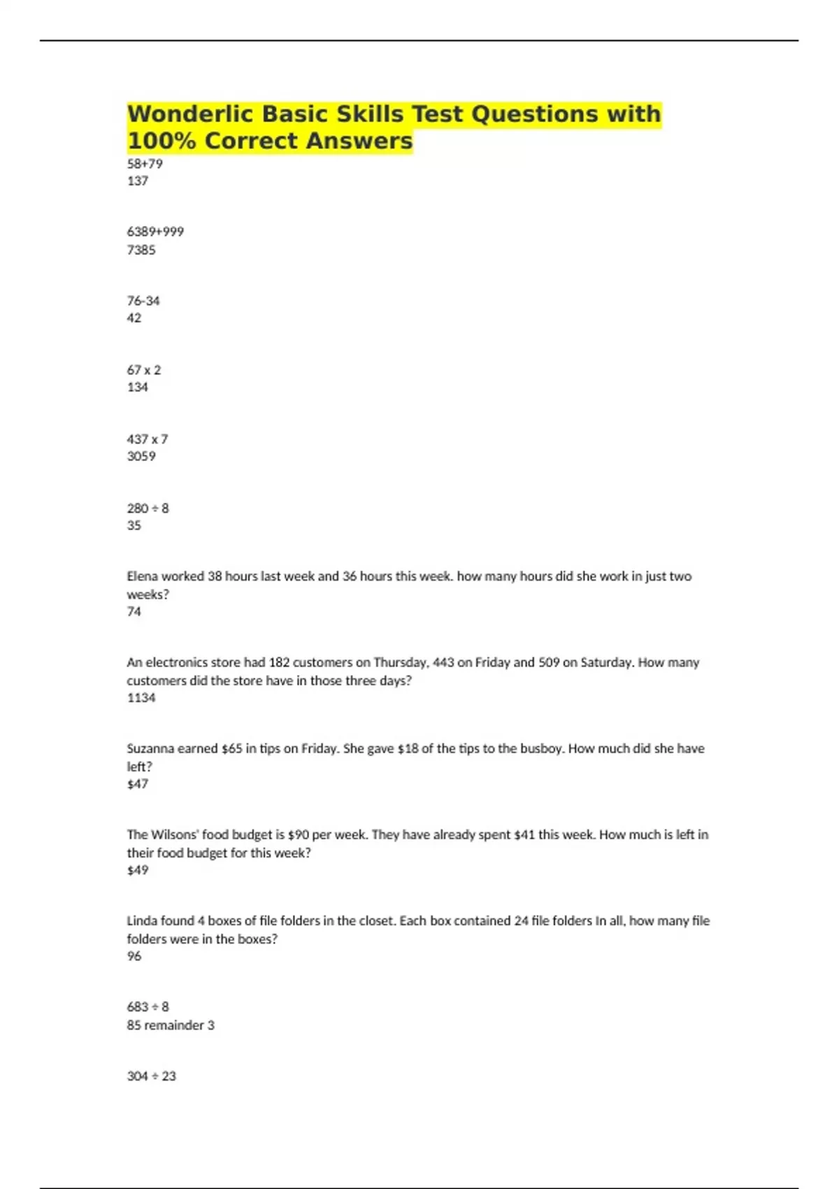 Wonderlic Basic Skills Test Questions with 100% Correct Answers 58+79 137 6389+999 7385 76-34 42 67 x 2 134 437 x 7 3059 280 ÷ 8 35 Elena worked 38 hours last week and 36 hours this week. how many hours did she work in just two weeks? 74 An electronics store had 182 customers on Thursday, 443 on Friday and 509 on Saturday. How many customers did the store have in those three days? 1134 Suzanna earned $65 in tips on Friday. She gave $18 of the tips to the busboy. How much did she have left? $47 The Wilsons' food budget is $90 per week. They have already spent $41 this week. How much is left in their food budget for this week? $49 Linda found 4 boxes of file folders in the closet. Each box contained 24 file folders In all, how many file folders were in the boxes? 96 683 ÷ 8 85 remainder 3