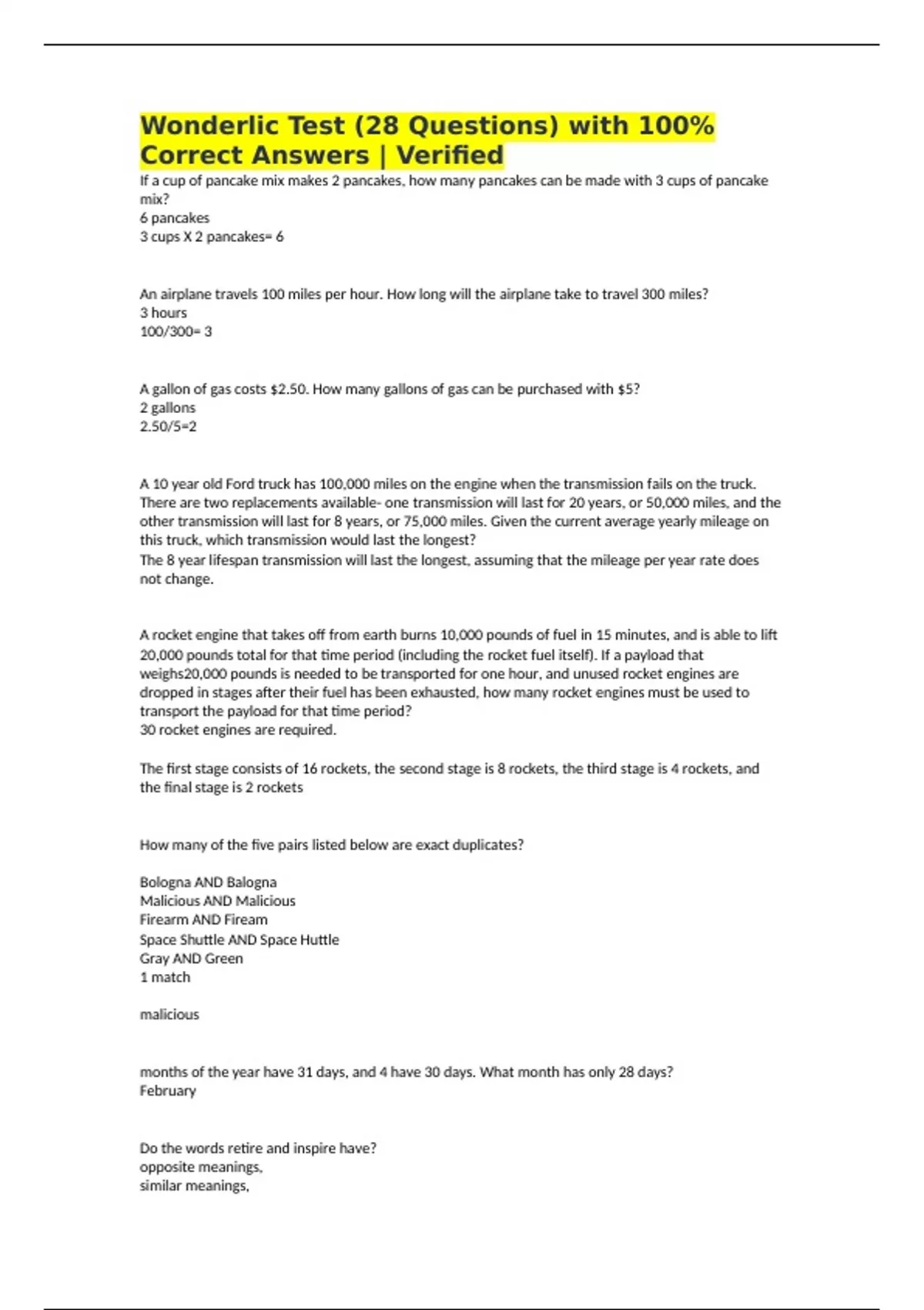 Wonderlic Test (28 Questions) with 100% Correct Answers | Verified If a cup of pancake mix makes 2 pancakes, how many pancakes can be made with 3 cups of pancake mix? 6 pancakes 3 cups X 2 pancakes= 6 An airplane travels 100 miles per hour. How long will the airplane take to travel 300 miles? 3 hours 100/300= 3 A gallon of gas costs $2.50. How many gallons of gas can be purchased with $5? 2 gallons 2.50/5=2 A 10 year old Ford truck has 100,000 miles on the engine when the transmission fails on the truck. There are two replacements available- one transmission will last for 20 years, or 50,000 miles, and the other transmission will last for 8 years, or 75,000 miles. Given the current average yearly mileage on this truck, which transmission would last the longest? The 8 year lifespan transmission will last the longest, assuming that the mileage per year rate does not change. A rocket engine that takes off from earth burns 10,000 pounds of fuel in 15 minutes, and is able to lift 20,000 pounds total for that time period (including the rocket fuel itself). If a payload that weighs20,000 pounds is needed to be transported for one hour, and unused rocket engines are dropped in stages after their fuel has been exhausted, how many rocket engines must be used to transport the payload for that time period? 30 rocket engines are required. The first stage consists of 16 rockets, the second stage is 8 rockets, the third stage is 4 rockets, and the final stage is 2 rockets How many of the five pairs listed below are exact duplicates? Bologna AND Balogna Malicious AND Malicious Firearm AND Fiream Space Shuttle AND Space Huttle Gray AND Green 1 match malicious months of the year have 31 days, and 4 have 30 days. What month has only 28 days? February Do the words retire and inspire have? opposite meanings, similar meanings, or no relation? No relationship Do the words hypothesis and theory have? opposite meanings, similar meanings, or no relation? Similar meanings Hypothesis: a supposition or proposed explanation made on the basis of limited evidence as a starting point. Theory: a supposition or a system of ideas intended to explain something. Choose the verb that correctly completes the sentence: Have you ________ the painting yet? A) Finish B) Finishes C) Finishing D) Finished D) Finished 56/4= A) 16 B) 9 C) 14 D) 23 C) 14 The 5:15 train takes 2 hours and 10 minutes to get to Graystone. Today the train will be late. What time will it get to Graystone? A) 7:15 B) 7:05 C) 7:25 D) 7:40 D) 7:40 Choose the answer that most nearly means the same as the underlined word: An inaccuracy is a: A) Mistake B) Type of Medicine C) Prison D) Chance Happening A) Mistake A synonym of firmament is: A) Ground B) River C) Sky D) Future C) Sky