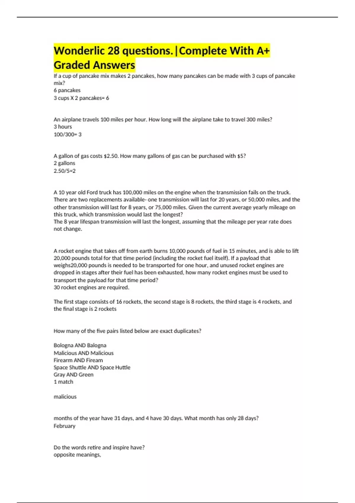 Wonderlic 28 questions.|Complete With A+ Graded Answers If a cup of pancake mix makes 2 pancakes, how many pancakes can be made with 3 cups of pancake mix? 6 pancakes 3 cups X 2 pancakes= 6 An airplane travels 100 miles per hour. How long will the airplane take to travel 300 miles? 3 hours 100/300= 3 A gallon of gas costs $2.50. How many gallons of gas can be purchased with $5? 2 gallons 2.50/5=2 A 10 year old Ford truck has 100,000 miles on the engine when the transmission fails on the truck. There are two replacements available- one transmission will last for 20 years, or 50,000 miles, and the other transmission will last for 8 years, or 75,000 miles. Given the current average yearly mileage on this truck, which transmission would last the longest? The 8 year lifespan transmission will last the longest, assuming that the mileage per year rate does not change. A rocket engine that takes off from earth burns 10,000 pounds of fuel in 15 minutes, and is able to lift 20,000 pounds total for that time period (including the rocket fuel itself). If a payload that weighs20,000 pounds is needed to be transported for one hour, and unused rocket engines are dropped in stages after their fuel has been exhausted, how many rocket engines must be used to transport the payload for that time period? 30 rocket engines are required. The first stage consists of 16 rockets, the second stage is 8 rockets, the third stage is 4 rockets, and the final stage is 2 rockets How many of the five pairs listed below are exact duplicates? Bologna AND Balogna Malicious AND Malicious Firearm AND Fiream Space Shuttle AND Space Huttle Gray AND Green 1 match malicious months of the year have 31 days, and 4 have 30 days. What month has only 28 days? February Do the words retire and inspire have? opposite meanings, similar meanings, or no relation? No relationship Do the words hypothesis and theory have? opposite meanings, similar meanings, or no relation? Similar meanings Hypothesis: a supposition or proposed explanation made on the basis of limited evidence as a starting point. Theory: a supposition or a system of ideas intended to explain something. Choose the verb that correctly completes the sentence: Have you ________ the painting yet? A) Finish B) Finishes C) Finishing D) Finished D) Finished 56/4= A) 16 B) 9 C) 14 D) 23 C) 14 The 5:15 train takes 2 hours and 10 minutes to get to Graystone. Today the train will be late. What time will it get to Graystone? A) 7:15 B) 7:05 C) 7:25 D) 7:40 D) 7:40 Choose the answer that most nearly means the same as the underlined word: An inaccuracy is a: A) Mistake B) Type of Medicine C) Prison D) Chance Happening A) Mistake A synonym of firmament is: A) Ground B) River C) Sky D) Future C) Sky
