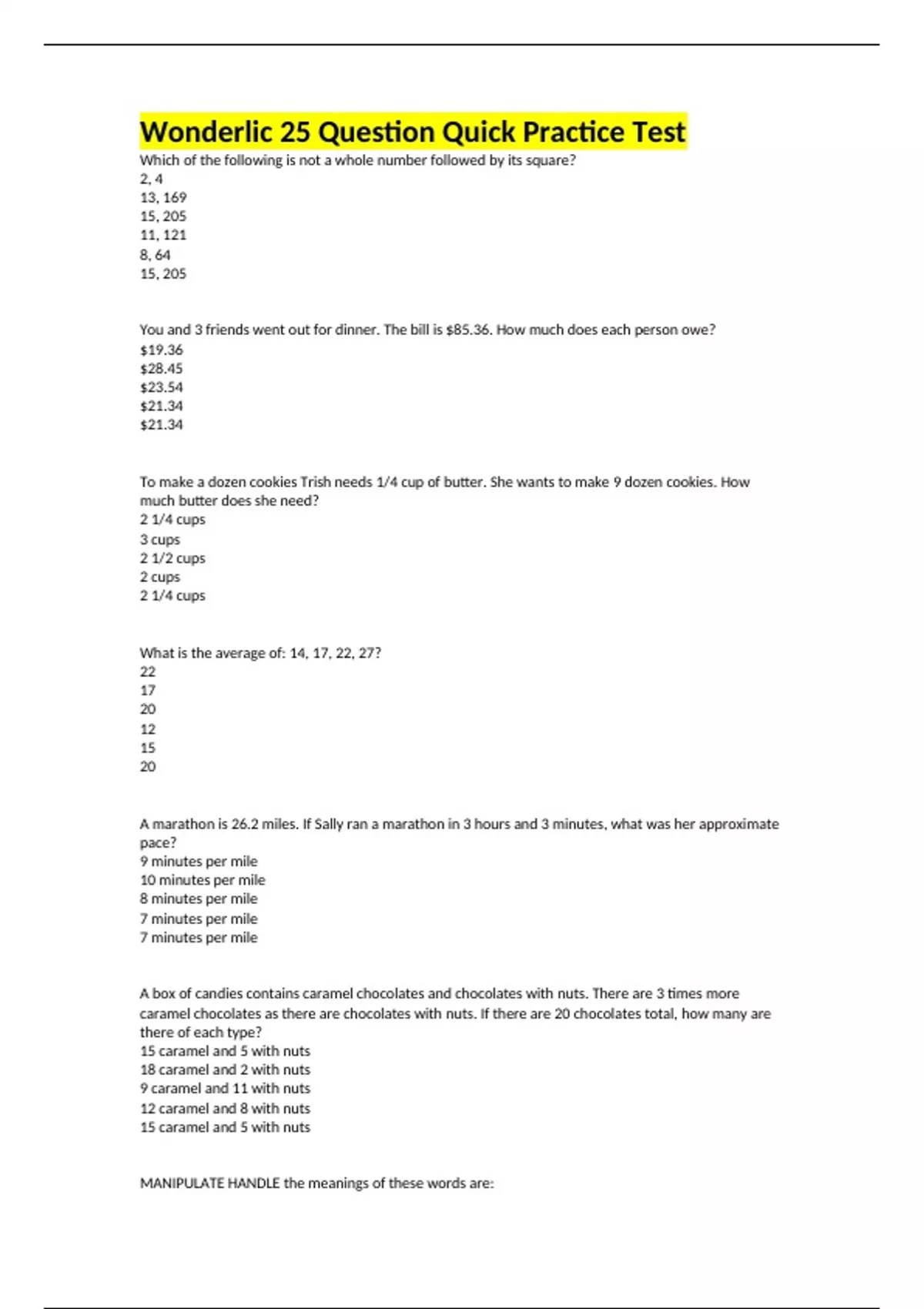 Wonderlic 25 Question Quick Practice Test Which of the following is not a whole number followed by its square? 2, 4 13, 169 15, 205 11, 121 8, 64 15, 205 You and 3 friends went out for dinner. The bill is $85.36. How much does each person owe? $19.36 $28.45 $23.54 $21.34 $21.34 To make a dozen cookies Trish needs 1/4 cup of butter. She wants to make 9 dozen cookies. How much butter does she need? 2 1/4 cups 3 cups 2 1/2 cups 2 cups 2 1/4 cups What is the average of: 14, 17, 22, 27? 22 17 20 12 15 20 A marathon is 26.2 miles. If Sally ran a marathon in 3 hours and 3 minutes, what was her approximate pace? 9 minutes per mile 10 minutes per mile 8 minutes per mile 7 minutes per mile 7 minutes per mile A box of candies contains caramel chocolates and chocolates with nuts. There are 3 times more caramel chocolates as there are chocolates with nuts. If there are 20 chocolates total, how many are there of each type? 15 caramel and 5 with nuts 18 caramel and 2 with nuts 9 caramel and 11 with nuts 12 caramel and 8 with nuts 15 caramel and 5 with nuts MANIPULATE HANDLE the meanings of these words are: