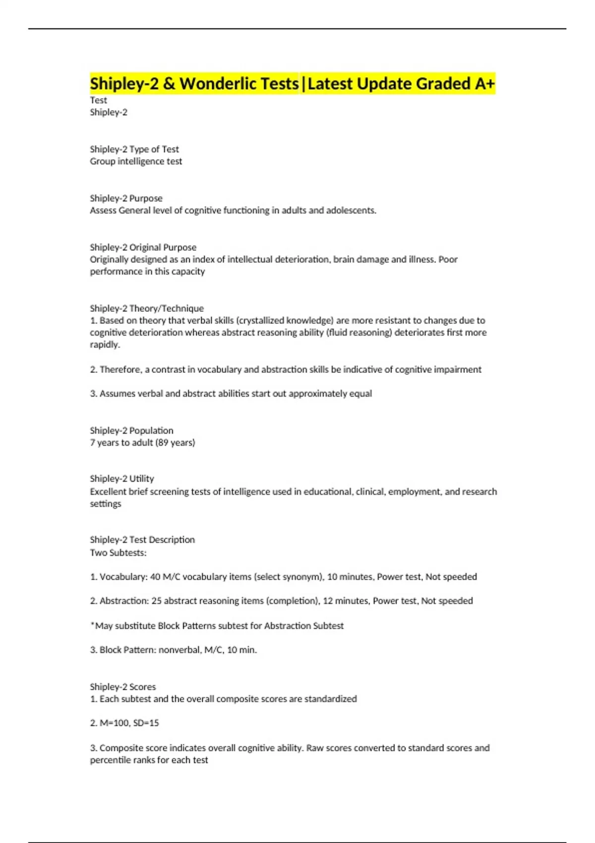 Shipley-2 & Wonderlic Tests|Latest Update Graded A+ Test Shipley-2 Shipley-2 Type of Test Group intelligence test Shipley-2 Purpose Assess General level of cognitive functioning in adults and adolescents. Shipley-2 Original Purpose Originally designed as an index of intellectual deterioration, brain damage and illness. Poor performance in this capacity Shipley-2 Theory/Technique 1. Based on theory that verbal skills (crystallized knowledge) are more resistant to changes due to cognitive deterioration whereas abstract reasoning ability (fluid reasoning) deteriorates first more rapidly. 2. Therefore, a contrast in vocabulary and abstraction skills be indicative of cognitive impairment 3. Assumes verbal and abstract abilities start out approximately equal Shipley-2 Population 7 years to adult (89 years) Shipley-2 Utility Excellent brief screening tests of intelligence used in educational, clinical, employment, and research settings Shipley-2 Test Description Two Subtests: 1. Vocabulary: 40 M/C vocabulary items (select synonym), 10 minutes, Power test, Not speeded 2. Abstraction: 25 abstract reasoning items (completion), 12 minutes, Power test, Not speeded *May substitute Block Patterns subtest for Abstraction Subtest 3. Block Pattern: nonverbal, M/C, 10 min. Shipley-2 Scores 1. Each subtest and the overall composite scores are standardized 2. M=100, SD=15 3. Composite score indicates overall cognitive ability. Raw scores converted to standard scores and percentile ranks for each test