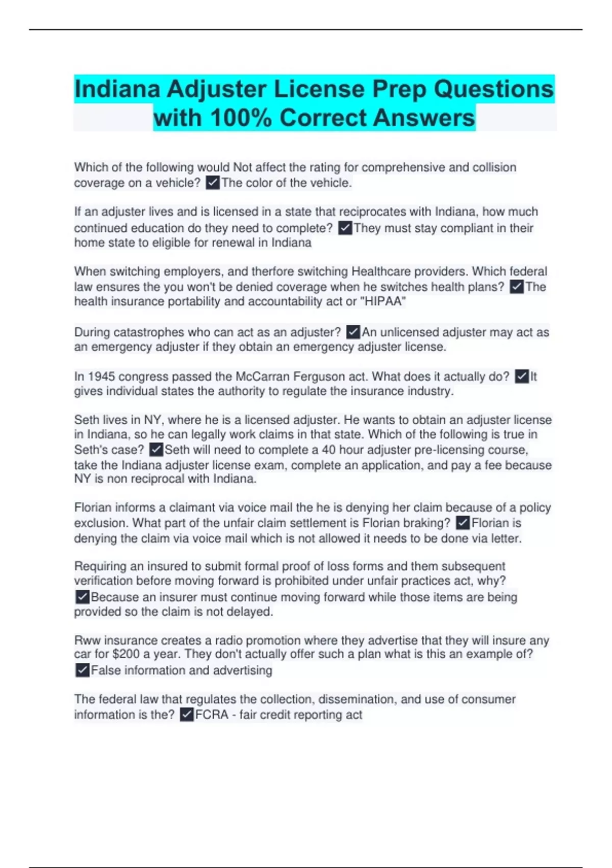 Indiana Adjuster License Prep Questions with 100% Correct Answers