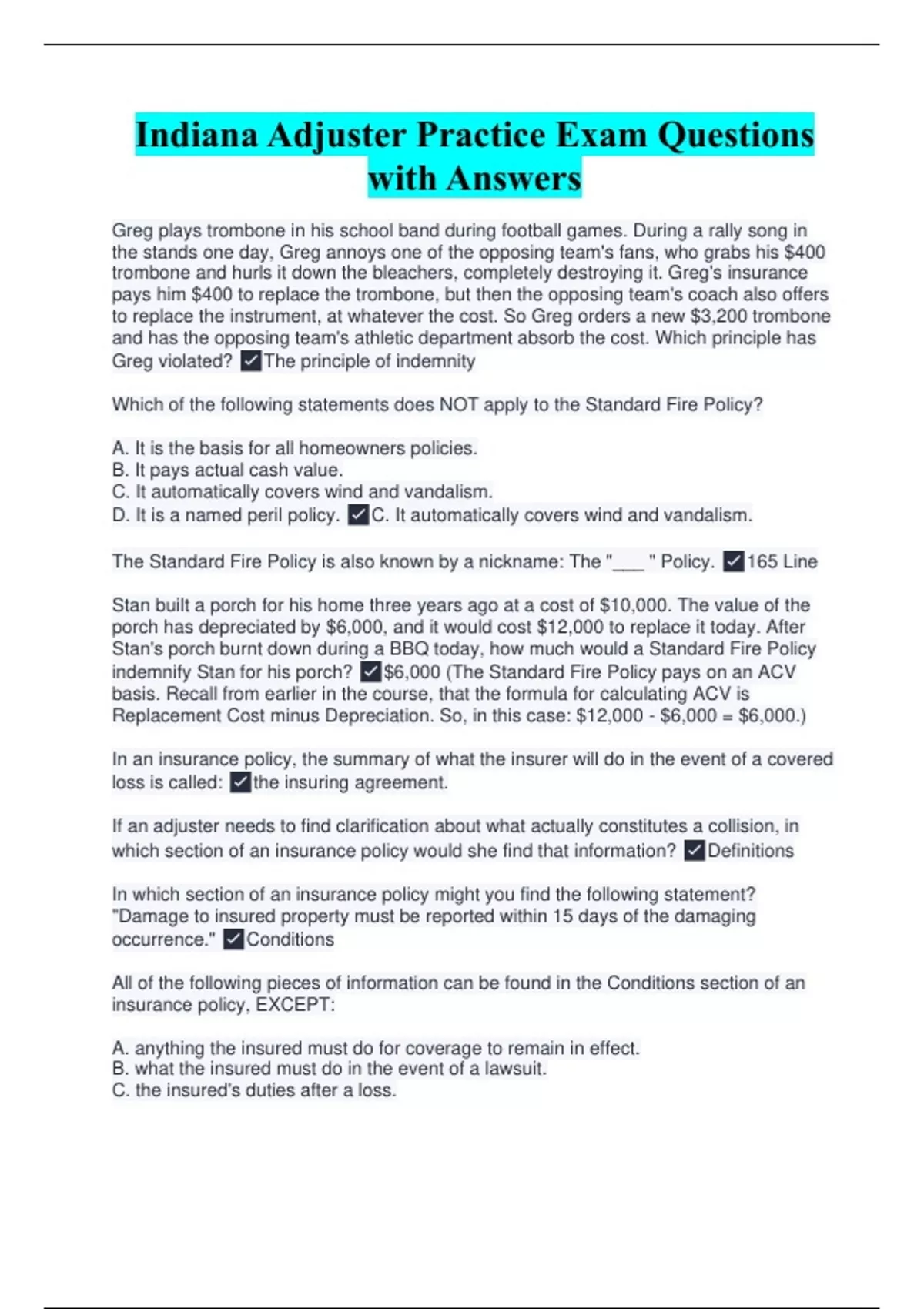 Greg plays trombone in his school band during football games. During a rally song in the stands one day, Greg annoys one of the opposing team's fans, who grabs his $400 trombone and hurls it down the bleachers, completely destroying it. Greg's insurance pays him $400 to replace the trombone, but then the opposing team's coach also offers to replace the instrument, at whatever the cost. So Greg orders a new $3,200 trombone and has the opposing team's athletic department absorb the cost. Which principle has Greg violated? The principle of indemnity Which of the following statements does NOT apply to the Standard Fire Policy? A. It is the basis for all homeowners policies. B. It pays actual cash value. C. It automatically covers wind and vandalism. D. It is a named peril policy. C. It automatically covers wind and vandalism. The Standard Fire Policy is also known by a nickname: The "___ " Policy. 165 Line Stan built a porch for his home three years ago at a cost of $10,000. The value of the porch has depreciated by $6,000, and it would cost $12,000 to replace it today. After Stan's porch burnt down during a BBQ today, how much would a Standard Fire Policy indemnify Stan for his porch? $6,000 (The Standard Fire Policy pays on an ACV basis. Recall from earlier in the course, that the formula for calculating ACV is Replacement Cost minus Depreciation. So, in this case: $12,000 - $6,000 = $6,000.) In an insurance policy, the summary of what the insurer will do in the event of a covered loss is called: the insuring agreement. If an adjuster needs to find clarification about what actually constitutes a collision, in which section of an insurance policy would she find that information? Definitions In which section of an insurance policy might you find the following statement? "Damage to insured property must be reported within 15 days of the damaging occurrence." Conditions All of the following pieces of information can be found in the Conditions section of an insurance policy, EXCEPT: A. anything the insured must do for coverage to remain in effect. B. what the insured must do in the event of a lawsuit. C. the insured's duties after a loss. D. causes of loss that are not covered. D. causes of loss that are not covered. Which of the following statements is true about an insurance policy? It relies on the utmost good faith of both the insured and the insurer. In a __________, only one party is legally obligated to perform. unilateral contract A reciprocal insurer is: an unincorporated organization of subscribers that operates through an attorney-in-fact to provide insurance benefits for its members.