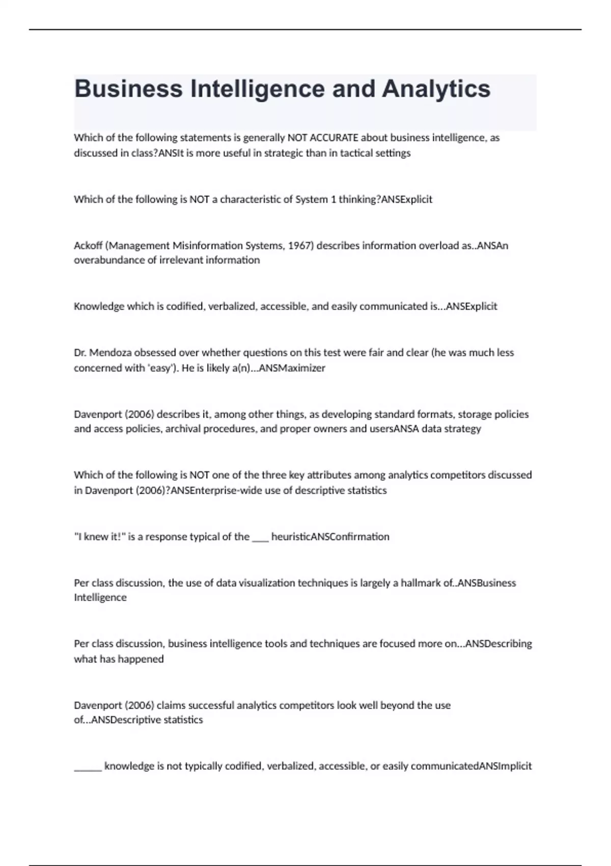 Business Intelligence and Analytics Exam Questions And Answers (RATED 100%)