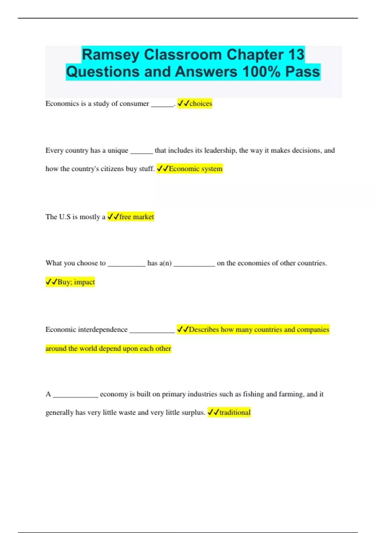 Ramsey Classroom Chapter 13 Questions and Answers 100% Pass Economics is a study of consumer ______. choices Every country has a unique ______ that includes its leadership, the way it makes decisions, and how the country's citizens buy stuff. Economic system The U.S is mostly a free market What you choose to __________ has a(n) ___________ on the economies of other countries. Buy; impact Economic interdependence ____________ Describes how many countries and companies around the world depend upon each other A ____________ economy is built on primary industries such as fishing and farming, and it generally has very little waste and very little surplus. traditional Equilibrium is.... When the market supply and demand match each other, resulting in price stability The buying and selling of various goods and services is called ____________. Trade _____________ is the science of the whole economy, while _____________ is the study of people, individual businesses, or markets. Macroeconomics; microeconomics You can depend on the people in power to either make you wealthy or make you poor. False Supply and demand helps us understand how the _________ of a particular product and the _________ for it affect the price of the item. Availability; desire A product that's sold to the global market is called _________ while a product that's bought from another country is called ___________. An export; an import Which factor of production refers to the man-made objects like tools, machinery, buildings, and equipment needed for production? Capital Socialism is an example of a _________ economy where the __________ is/are at the center. Command; government __________ is the desire to make a profit, and it isn't greedy. It keeps businesses in ___________. Profit motive; business Wind, water, and solar energy are examples of _____________. Renewable resources The series of steps it takes to produce a product