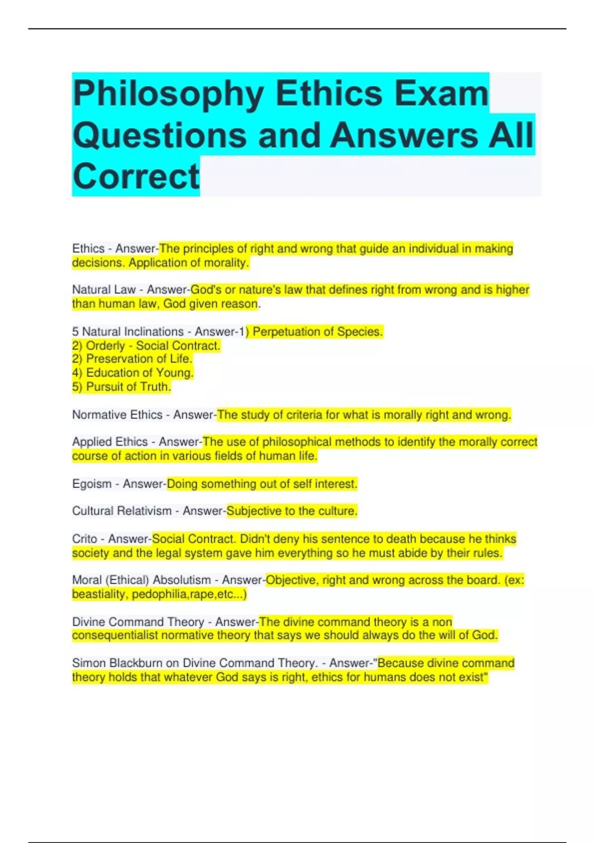 Philosophy Ethics Exam Questions and Answers All Correct Ethics - Answer-The principles of right and wrong that guide an individual in making decisions. Application of morality. Natural Law - Answer-God's or nature's law that defines right from wrong and is higher than human law, God given reason. 5 Natural Inclinations - Answer-1) Perpetuation of Species. 2) Orderly - Social Contract. 2) Preservation of Life. 4) Education of Young. 5) Pursuit of Truth. Normative Ethics - Answer-The study of criteria for what is morally right and wrong. Applied Ethics - Answer-The use of philosophical methods to identify the morally correct course of action in various fields of human life. Egoism - Answer-Doing something out of self interest. Cultural Relativism - Answer-Subjective to the culture. Crito - Answer-Social Contract. Didn't deny his sentence to death because he thinks society and the legal system gave him everything so he must abide by their rules. Moral (Ethical) Absolutism - Answer-Objective, right and wrong across the board. (ex: beastiality, pedophilia,rape,etc...) Divine Command Theory - Answer-The divine command theory is a non consequentialist normative theory that says we should always do the will of God.