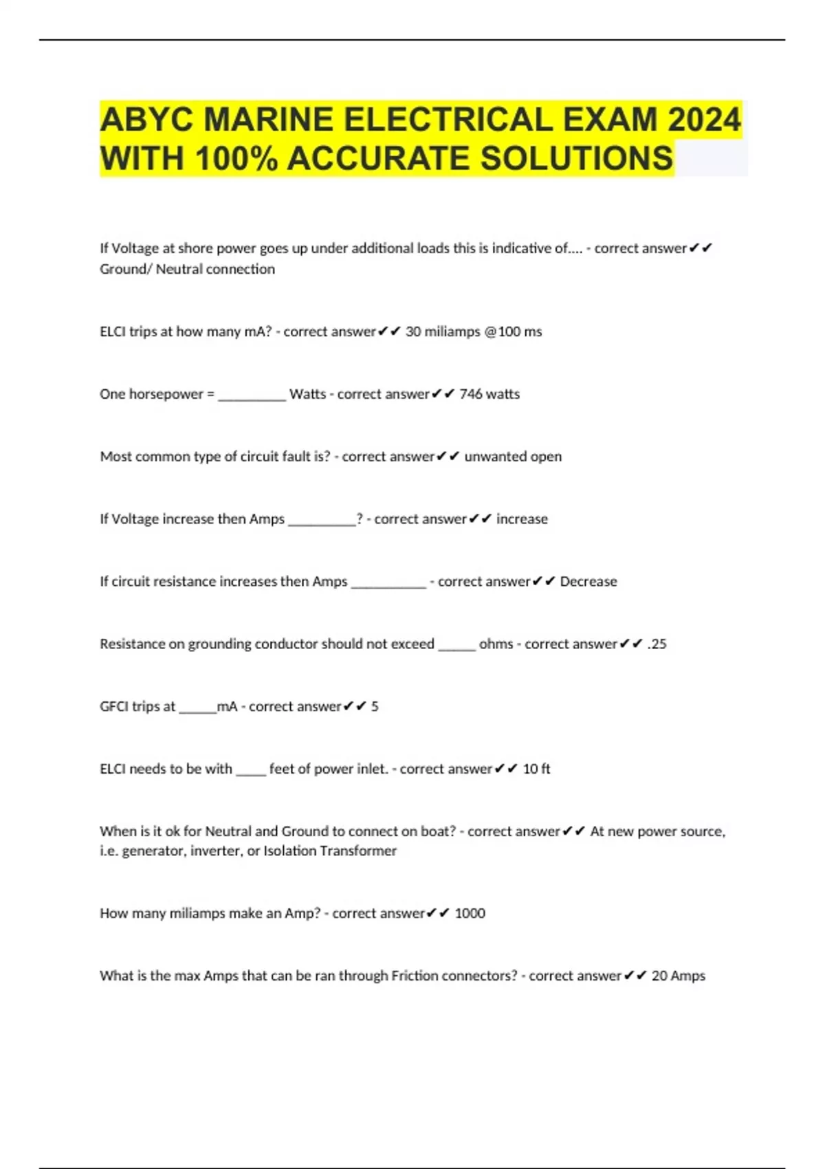 ABYC MARINE ELECTRICAL EXAM 2024 WITH 100% ACCURATE SOLUTIONS If Voltage at shore power goes up under additional loads this is indicative of.... - correct answer Ground/ Neutral connection ELCI trips at how many mA? - correct answer 30 miliamps @100 ms One horsepower = _________ Watts - correct answer 746 watts Most common type of circuit fault is? - correct answer unwanted open If Voltage increase then Amps _________? - correct answer increase If circuit resistance increases then Amps __________ - correct answer Decrease Resistance on grounding conductor should not exceed _____ ohms - correct answer .25 GFCI trips at _____mA - correct answer 5 ELCI needs to be with ____ feet of power inlet. - correct answer 10 ft